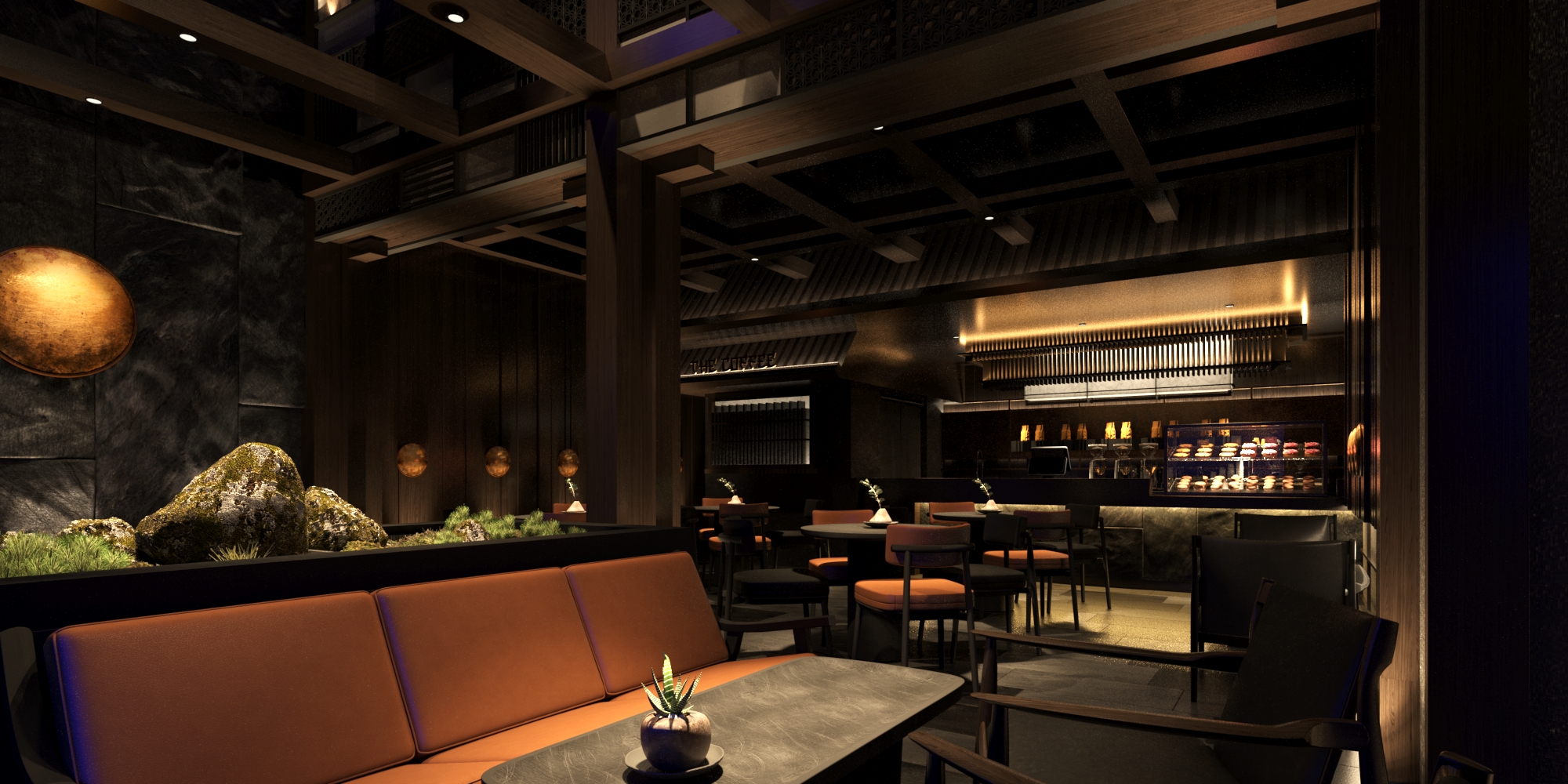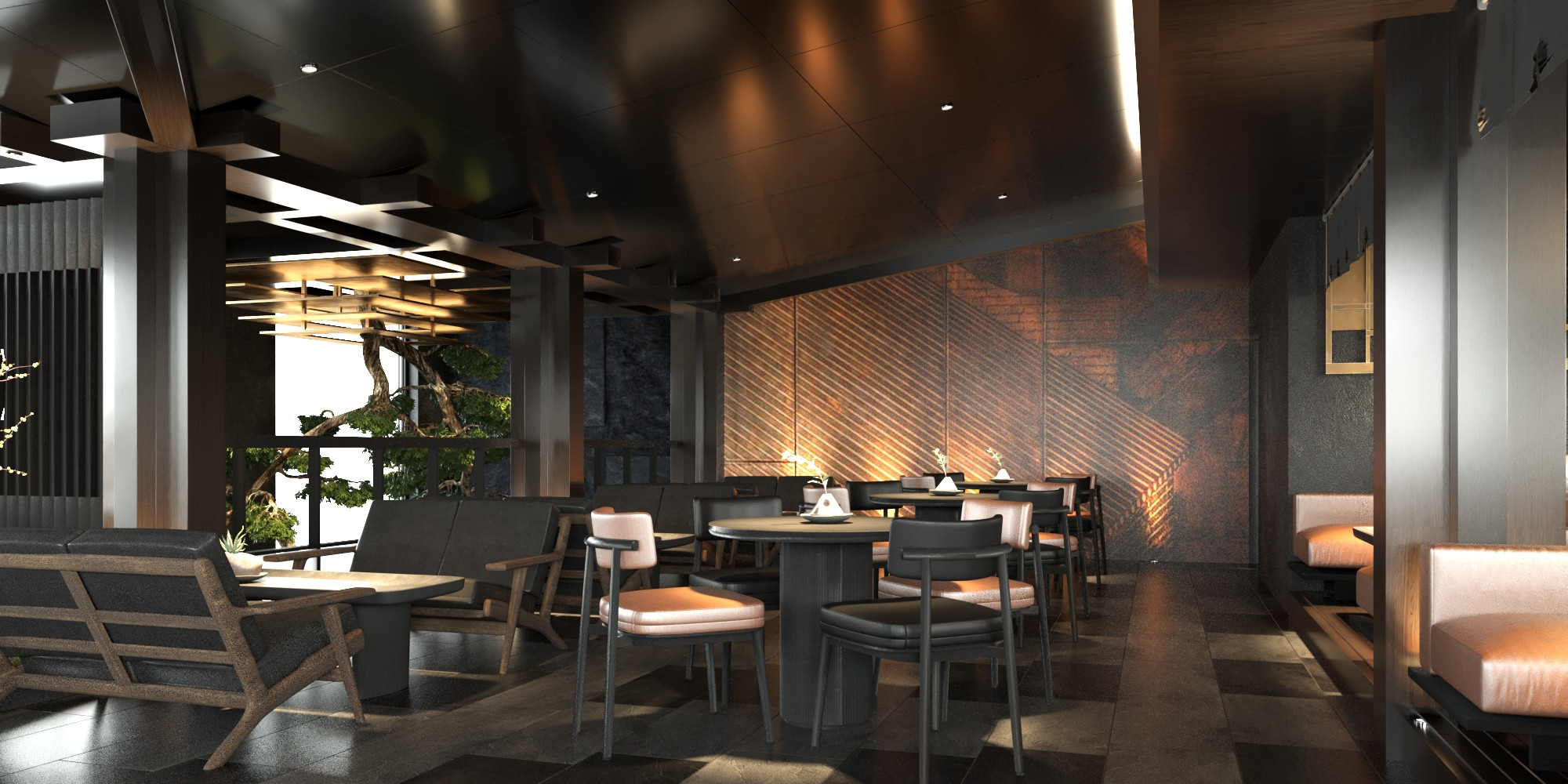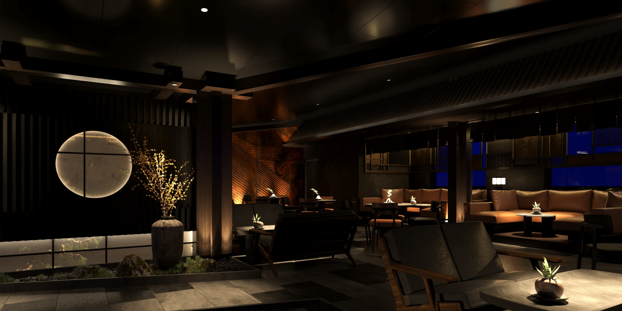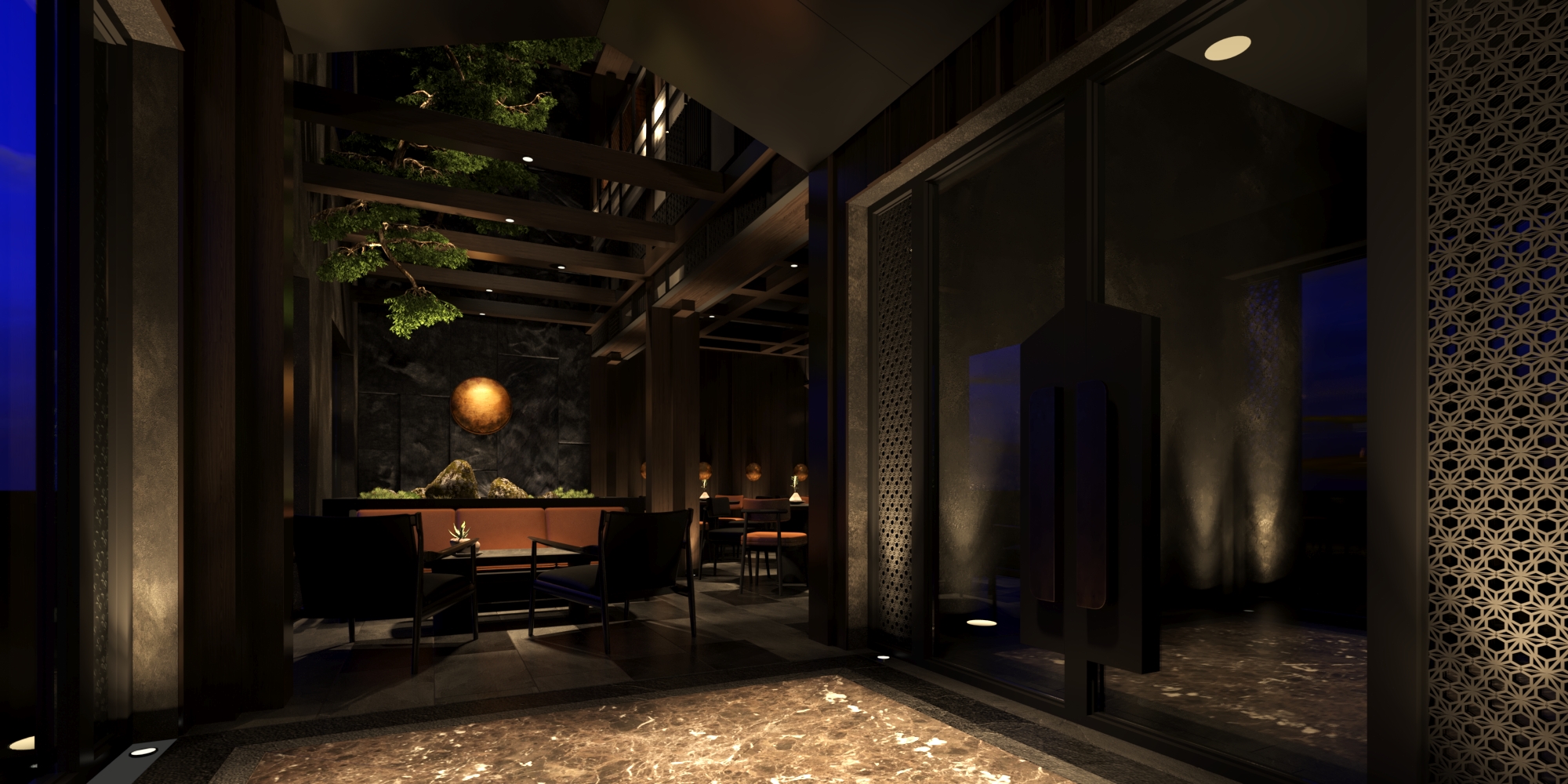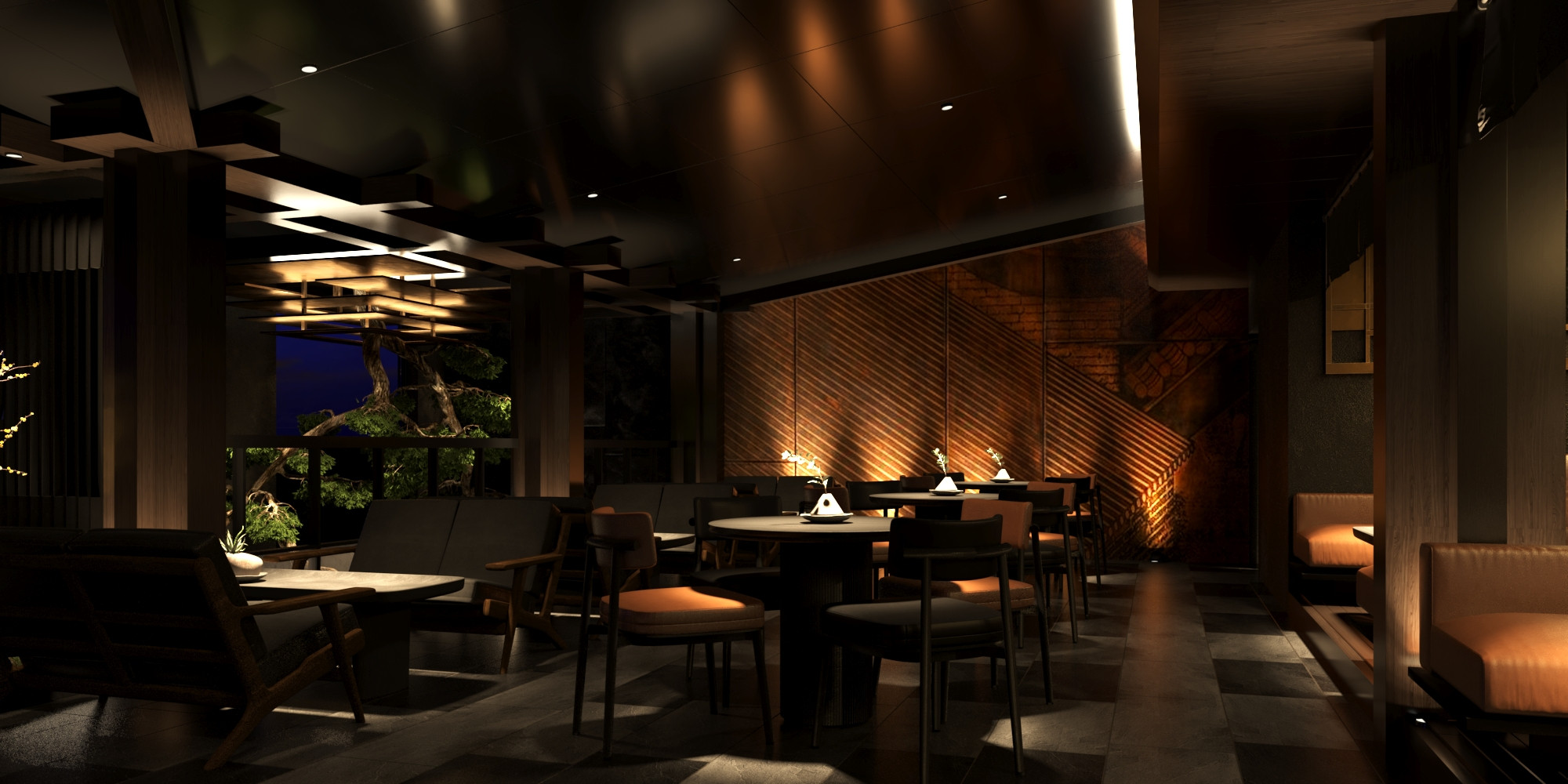 Điểm nhấn của không gian là hình ảnh ánh trăng và cây tùng Nhật Bản, kéo dài xuyên suốt không gian thông tầng, vừa tạo ra một hiệu ứng thẩm mỹ mạnh mẽ cho không gian nội thất, vừa thu hút sự chú ý từ bên ngoài, mang đến một trải nghiệm thị giác độc đáo cho khách hàng. Các chi tiết trang trí nhỏ như rèm Noren, giấy Shoji và các yếu tố văn hóa Nhật Bản khác được lồng ghép tinh tế vào từng góc quán, làm tăng sự duyên dáng và mang đậm dấu ấn văn hóa đặc sắc của Nhật.