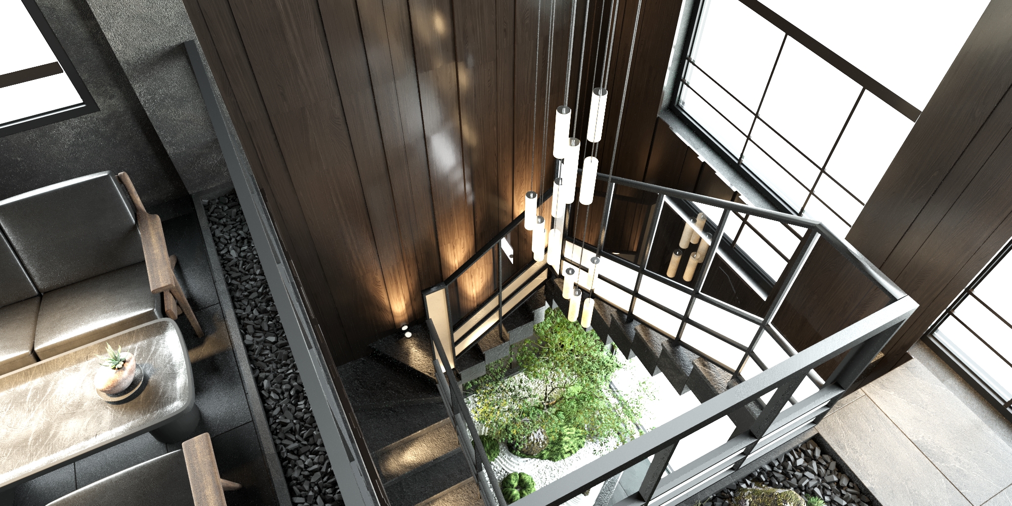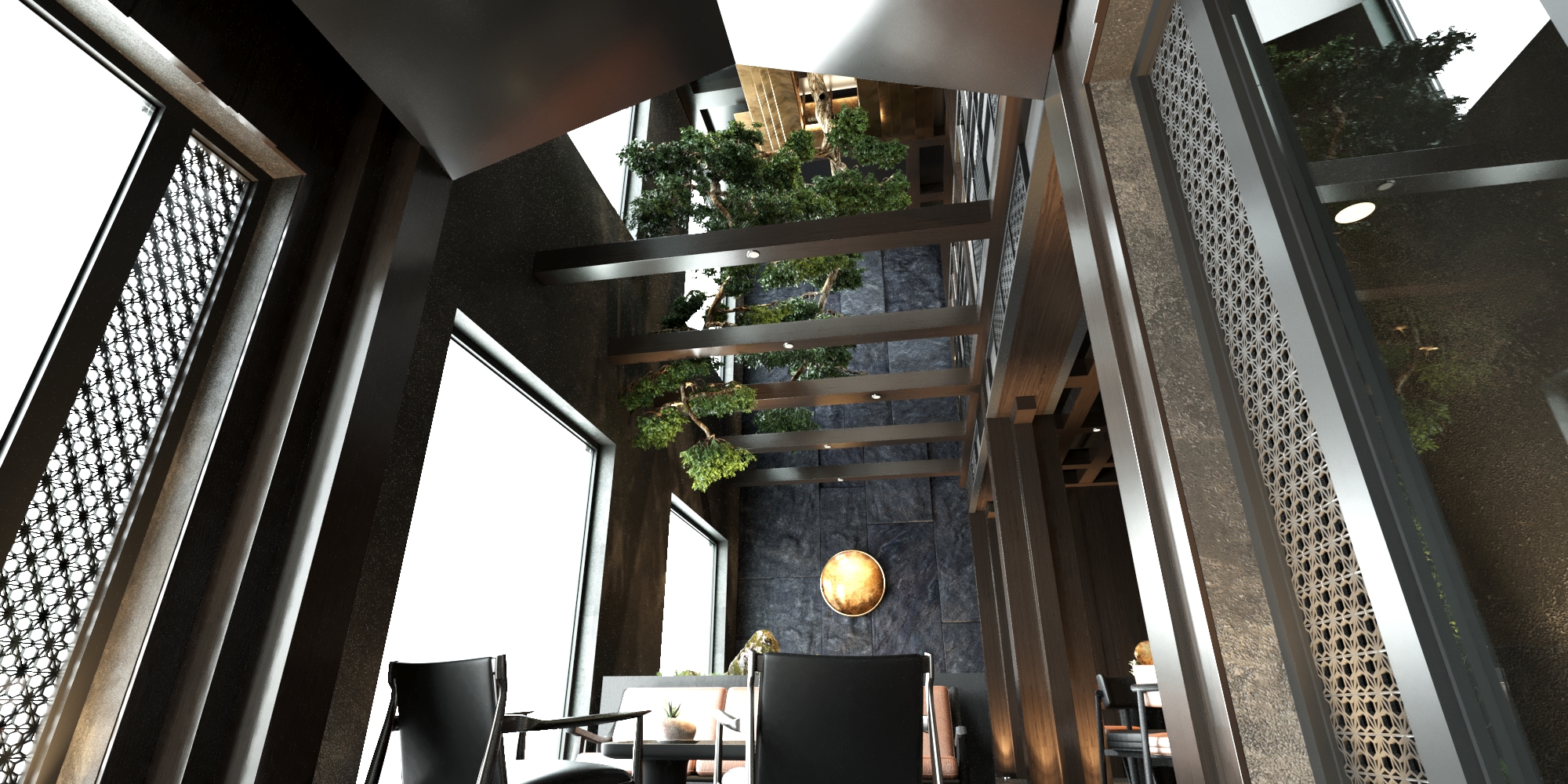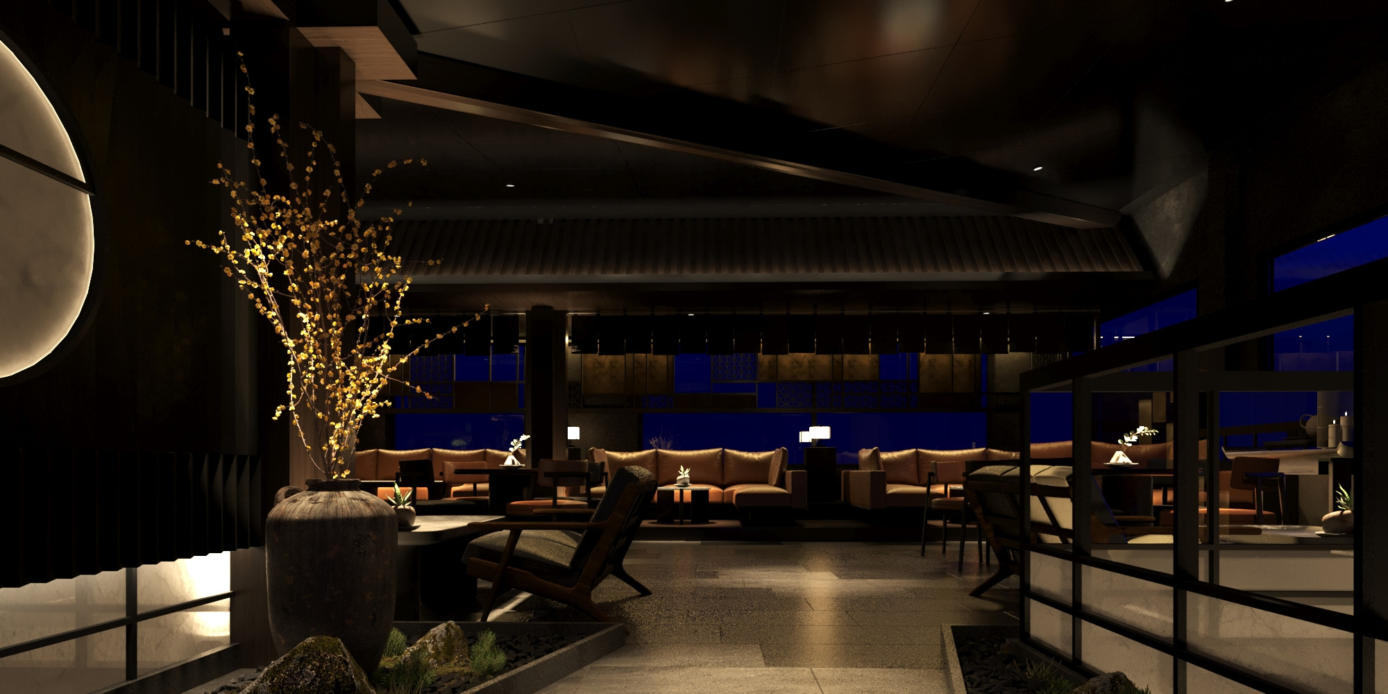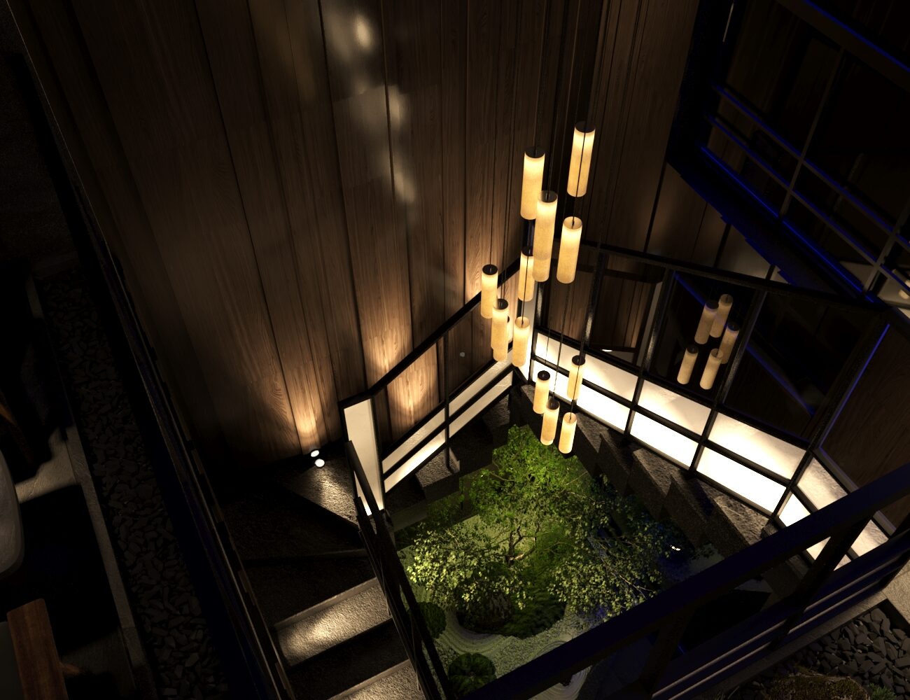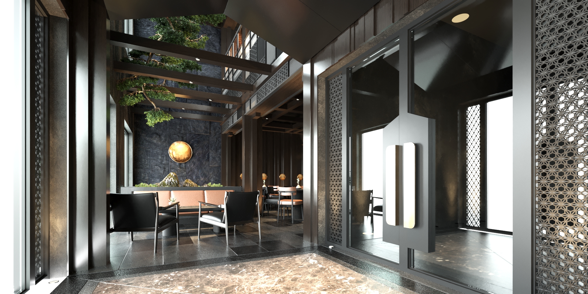 Điểm nhấn của không gian là hình ảnh ánh trăng và cây tùng Nhật Bản, kéo dài xuyên suốt không gian thông tầng, vừa tạo ra một hiệu ứng thẩm mỹ mạnh mẽ cho không gian nội thất, vừa thu hút sự chú ý từ bên ngoài, mang đến một trải nghiệm thị giác độc đáo cho khách hàng. Các chi tiết trang trí nhỏ như rèm Noren, giấy Shoji và các yếu tố văn hóa Nhật Bản khác được lồng ghép tinh tế vào từng góc quán, làm tăng sự duyên dáng và mang đậm dấu ấn văn hóa đặc sắc của Nhật.