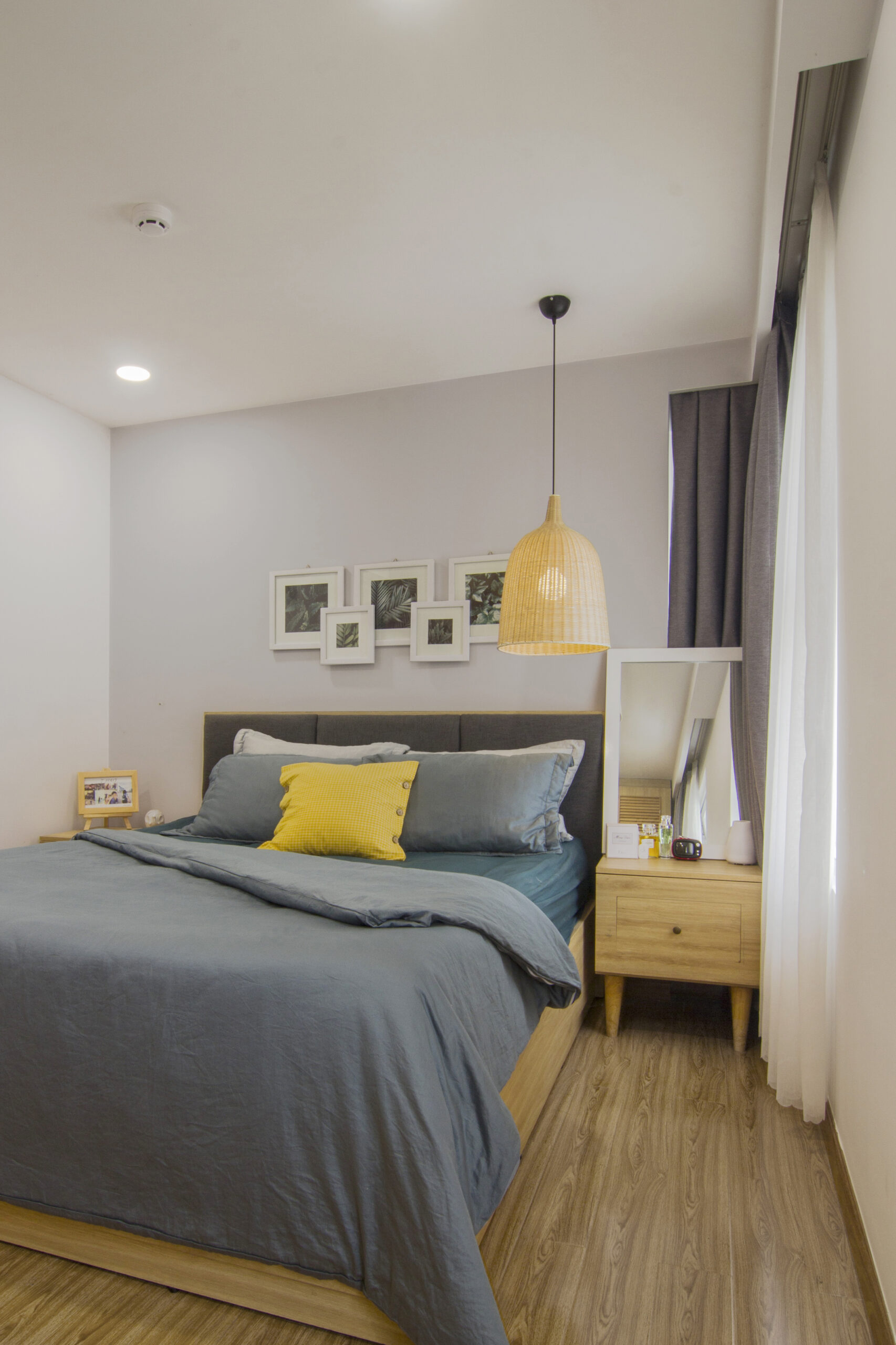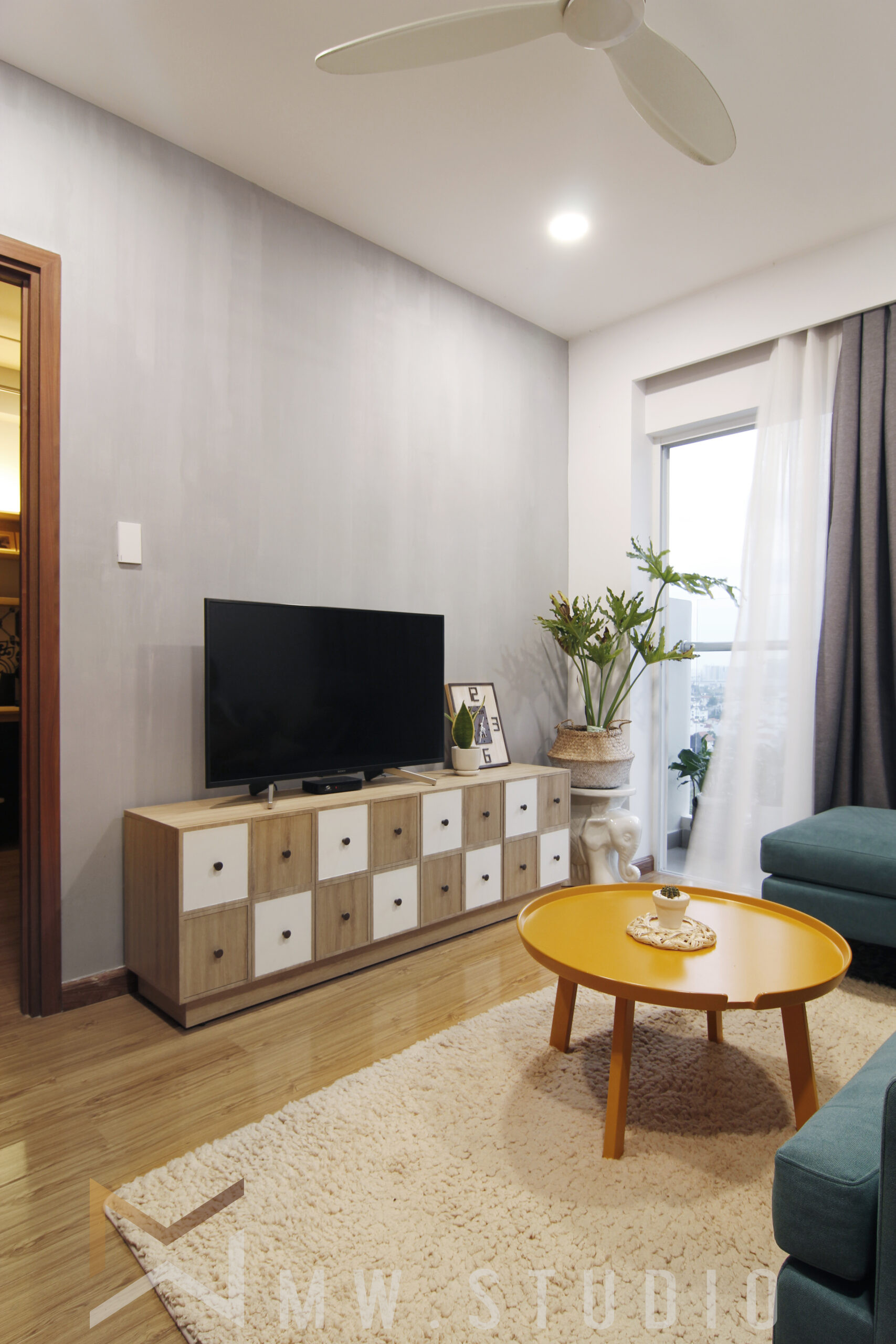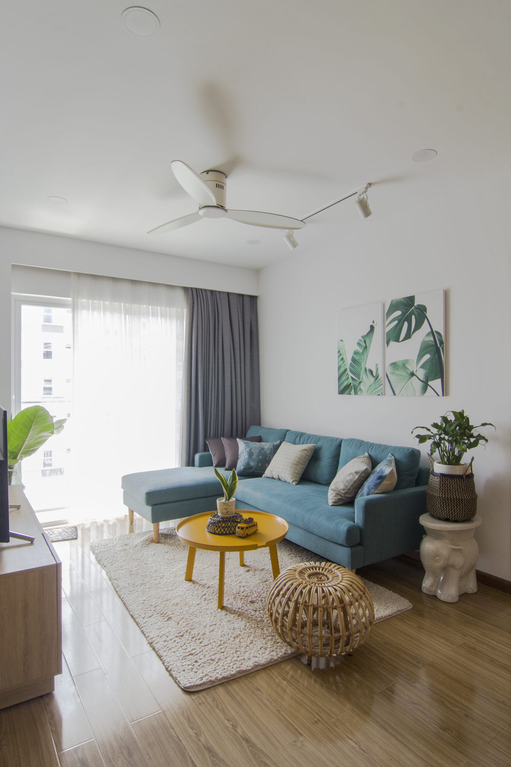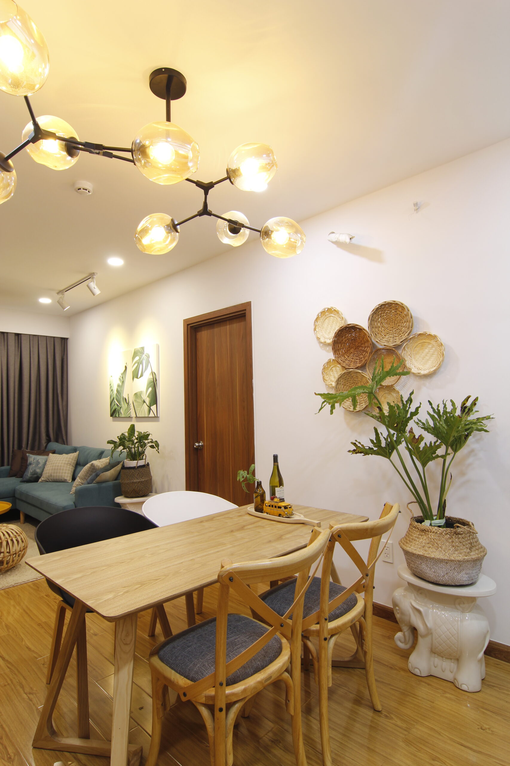 Ánh sáng tự nhiên được khai thác triệt để thông qua lớp rèm vải mỏng, vừa giúp che nắng hiệu quả mà vẫn cho phép ánh sáng tràn vào căn hộ. Bên cạnh đó, hệ thống đèn trang trí và đèn chiếu điểm với gam màu vàng ấm góp phần tạo ra một không gian ấm cúng, làm nổi bật không khí dễ chịu và thư giãn trong mỗi góc nhỏ của căn hộ.