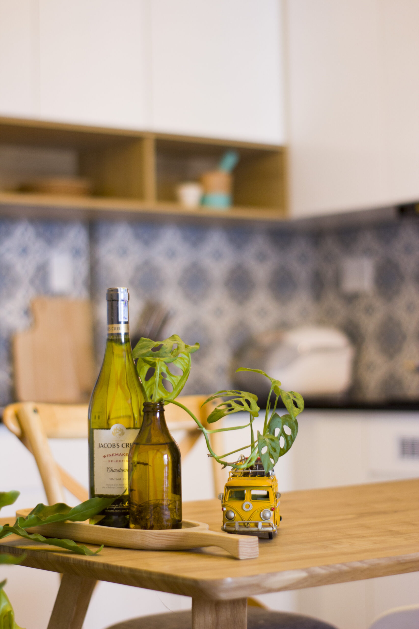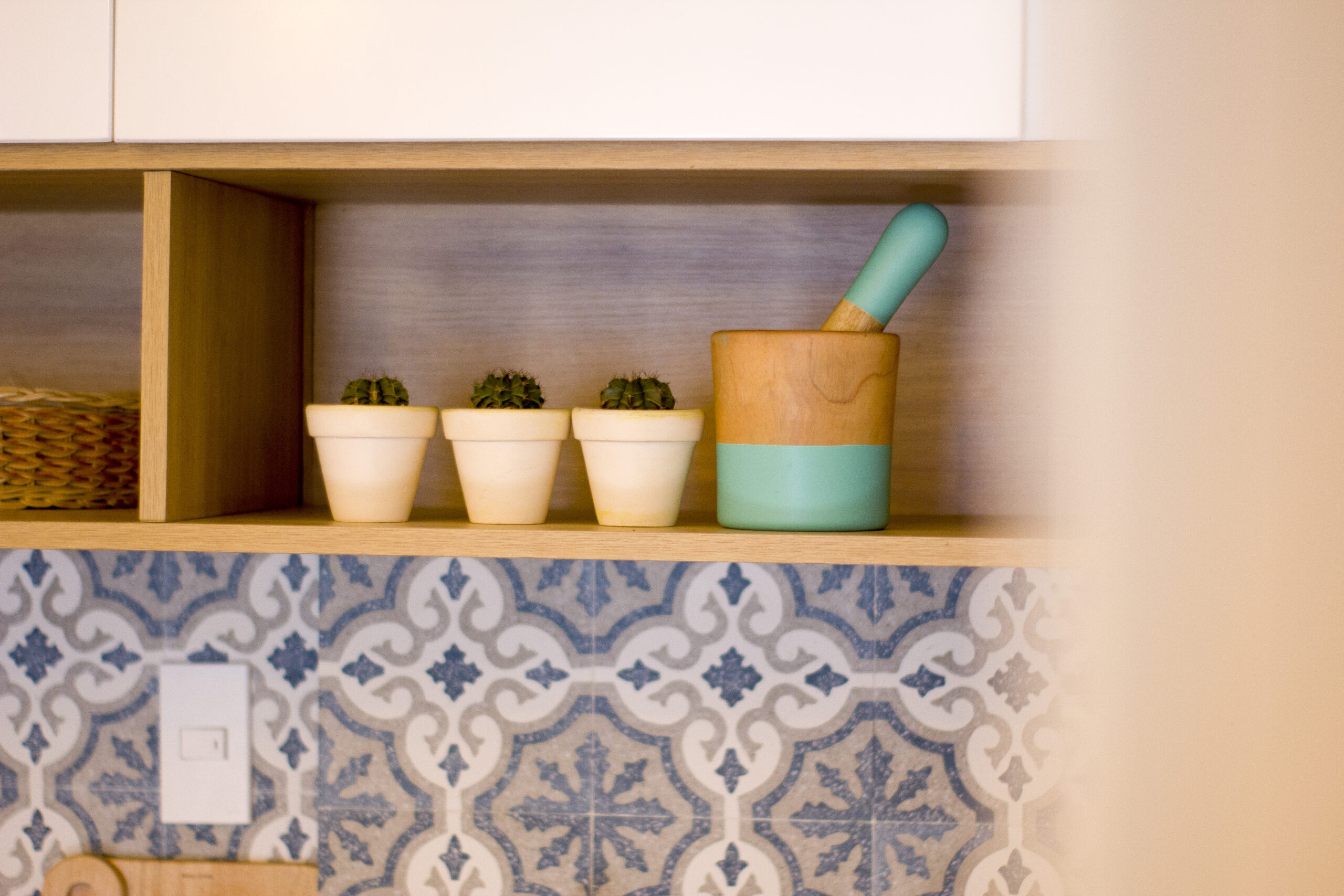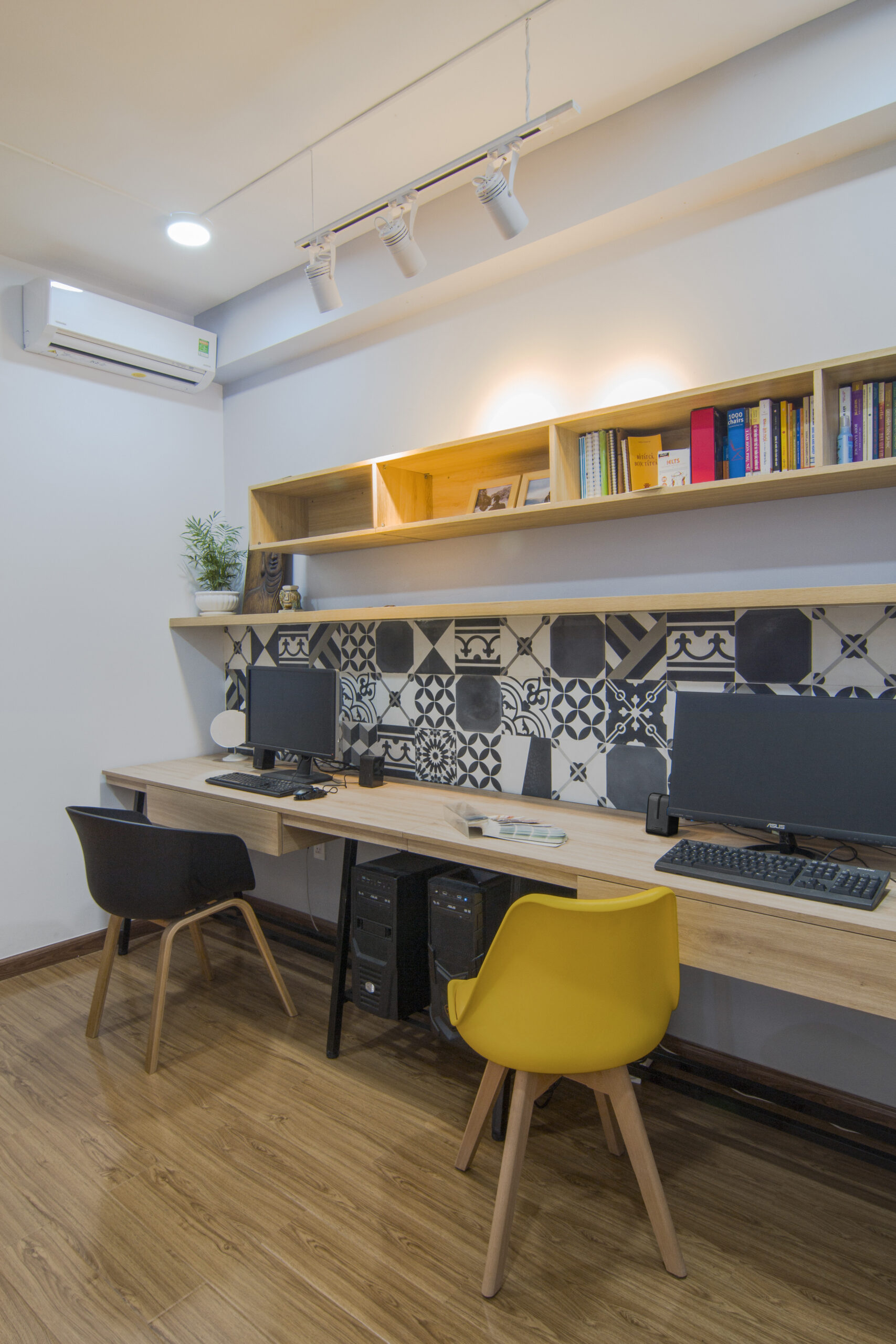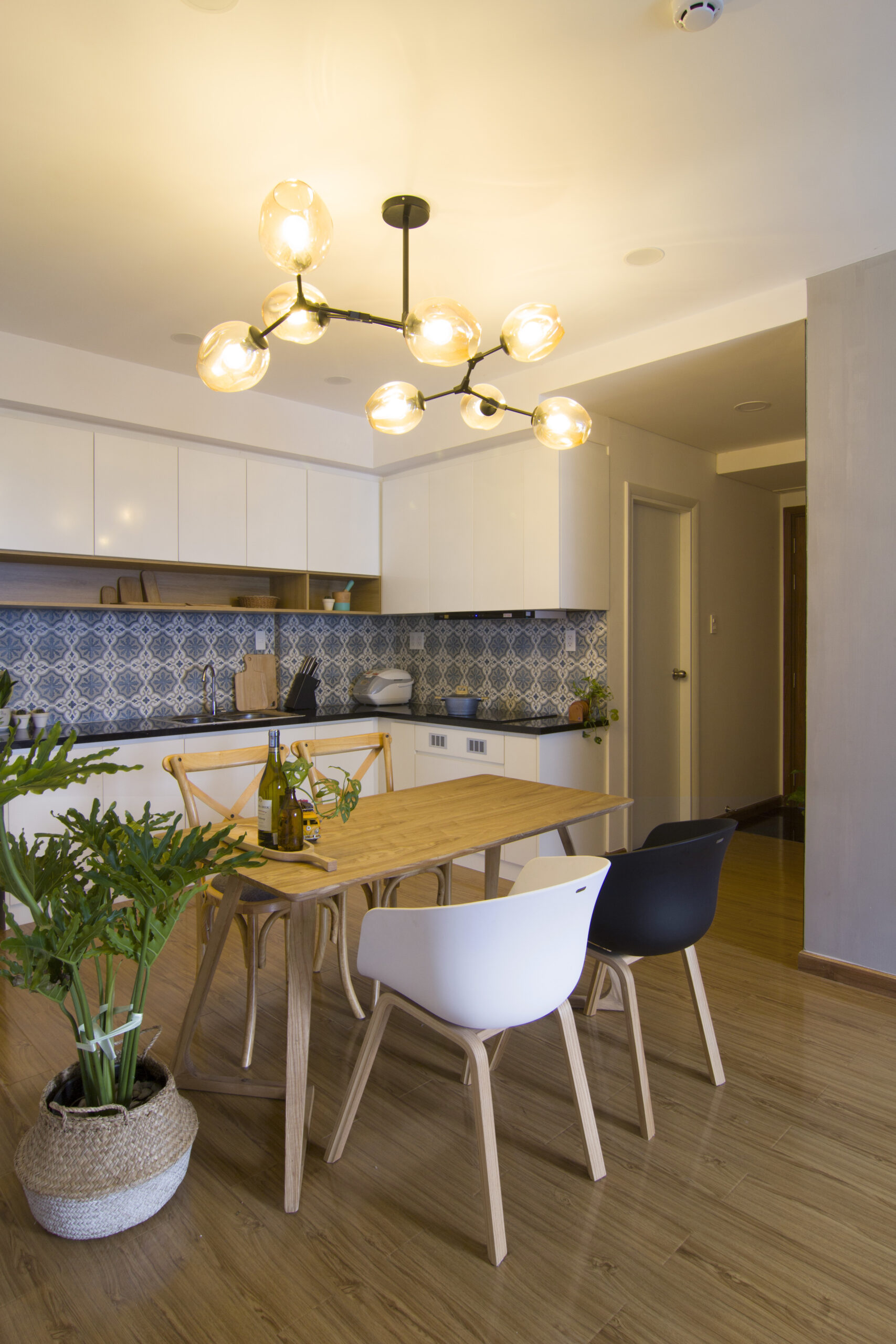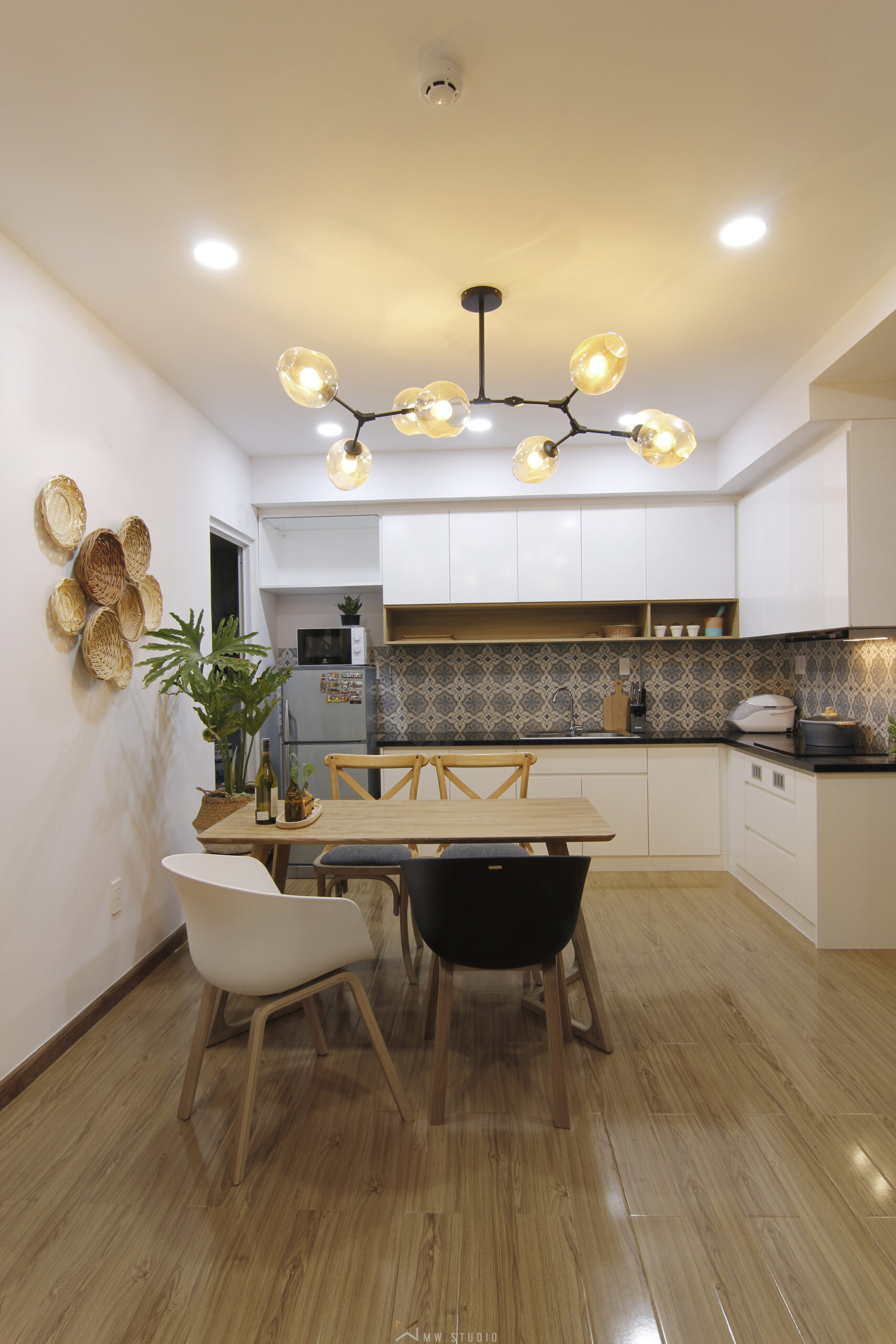 Căn hộ chung cư diện tích nhỏ, gồm 1 phòng ngủ, phòng khách bếp và phòng làm việc, được thiết kế theo phong cách hiện đại kết hợp với tinh thần tropical. Mục tiêu của thiết kế là tạo ra một không gian sống thư giãn, tươi mát, mang lại cảm giác nghỉ dưỡng ngay tại chính ngôi nhà của gia chủ. Những yếu tố tropical như họa tiết hoa lá, rổ rá, đèn mây… được khéo léo sử dụng để nhấn nhá, mang đến không gian sống gần gũi với thiên nhiên.