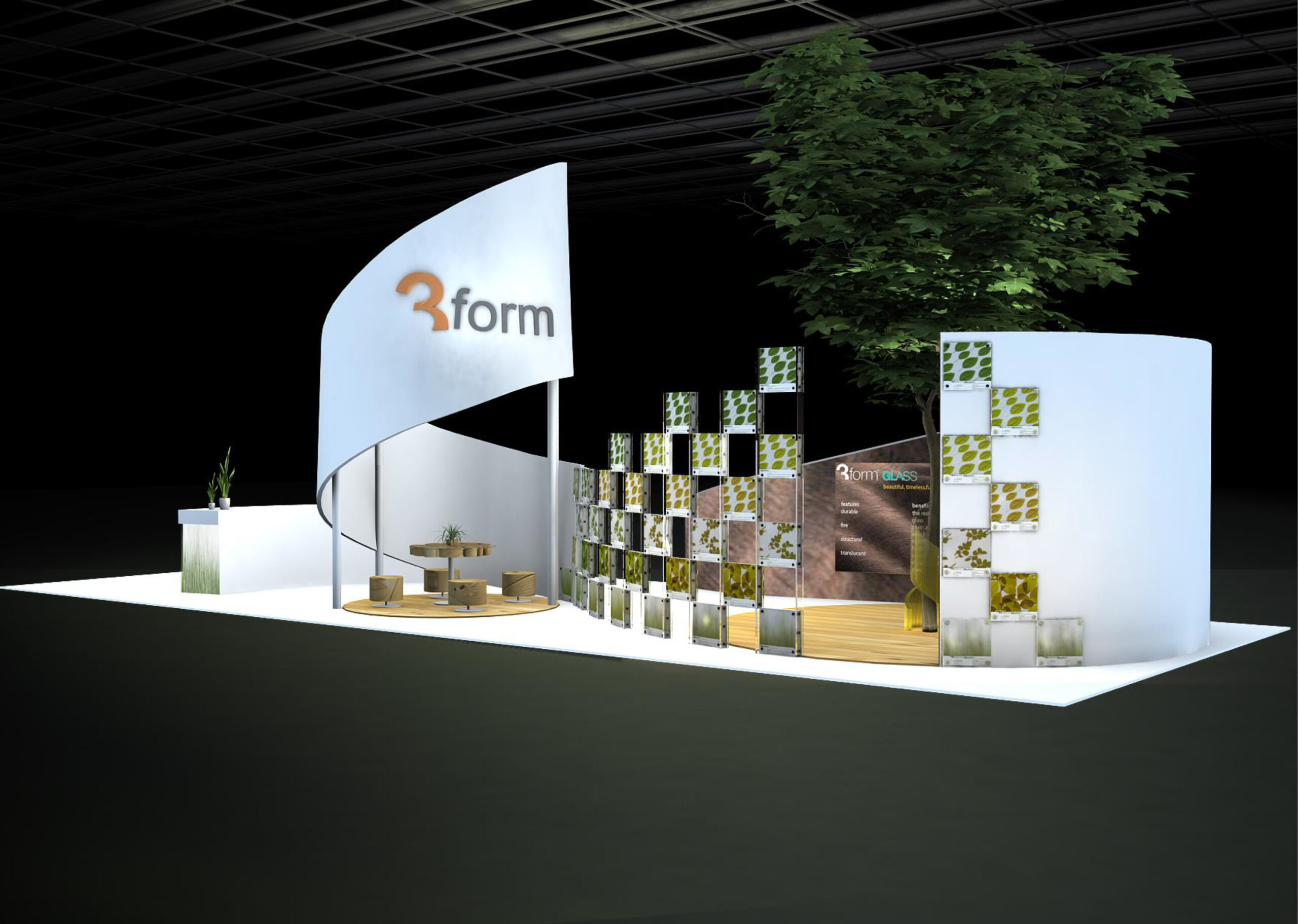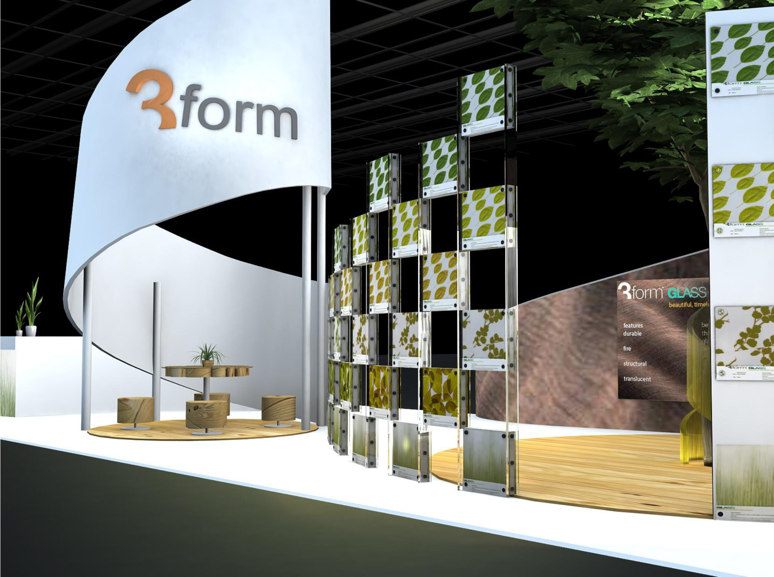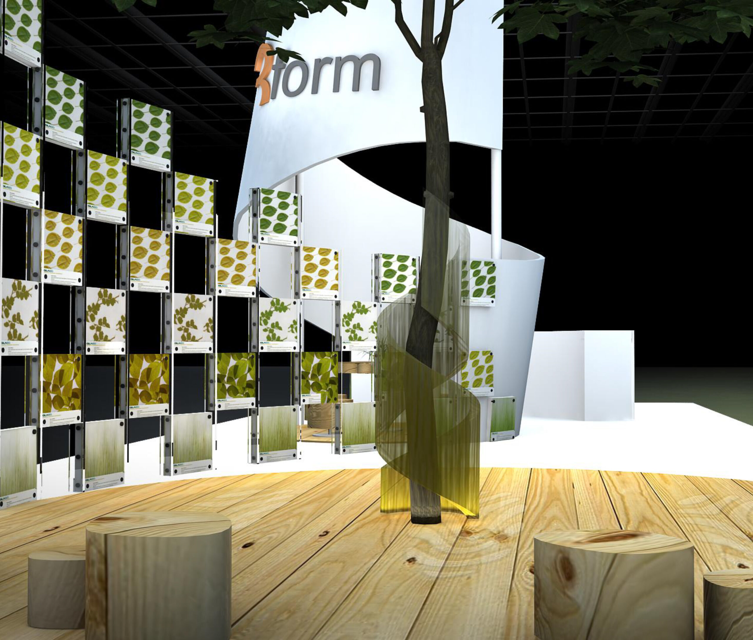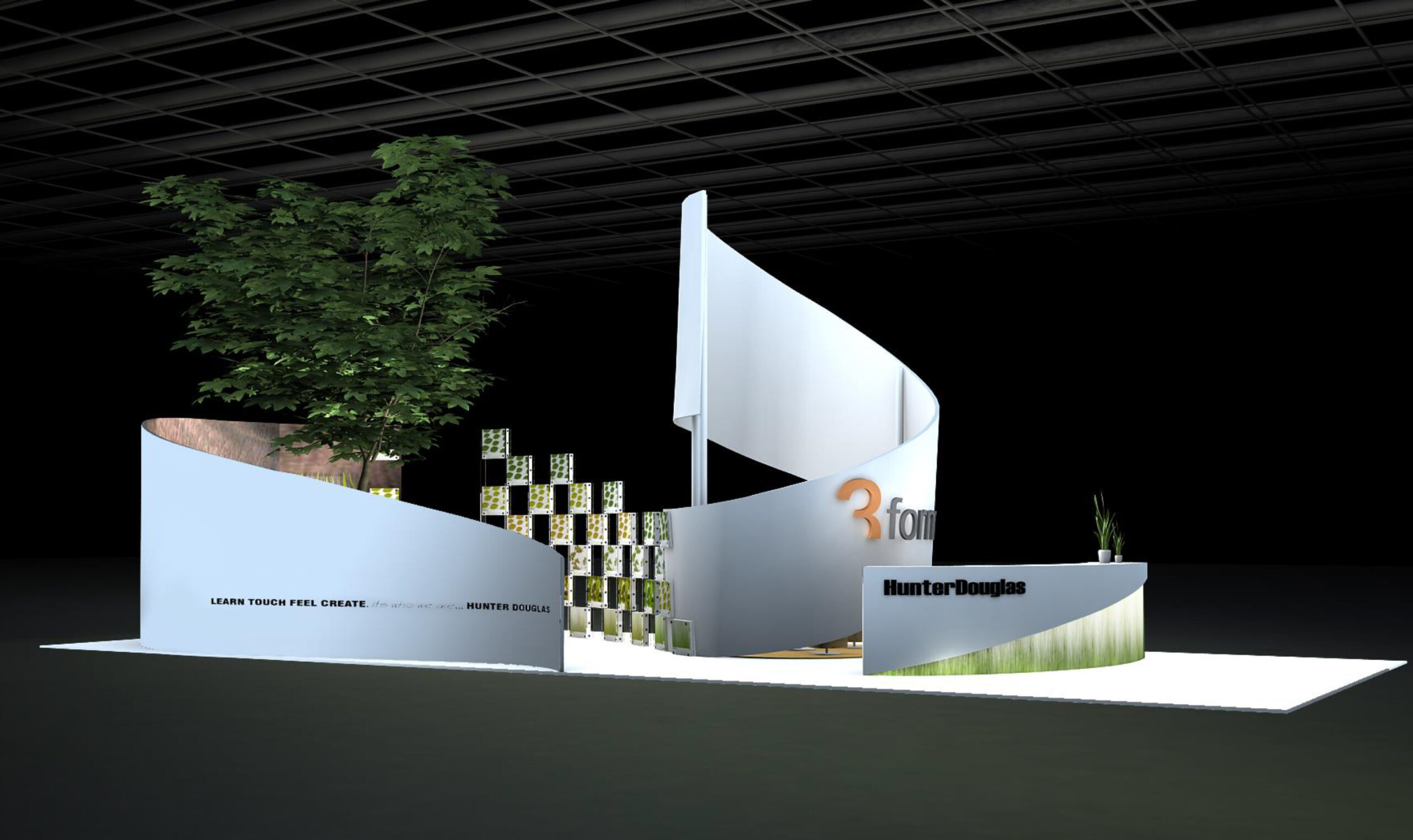 Gian hàng trưng bày dòng sản phẩm kính màu hữu cơ có khả năng ép uốn cong của thương hiệu 3form Hunter Douglas được thiết kế với các mảng cong chạy xuyên suốt, nhằm làm nổi bật đặc tính nổi trội của sản phẩm. Các đường cong mượt mà không chỉ tạo nên sự hài hòa, thẩm mỹ cho không gian mà còn phản ánh chính tính năng uốn cong linh hoạt của kính màu hữu cơ.