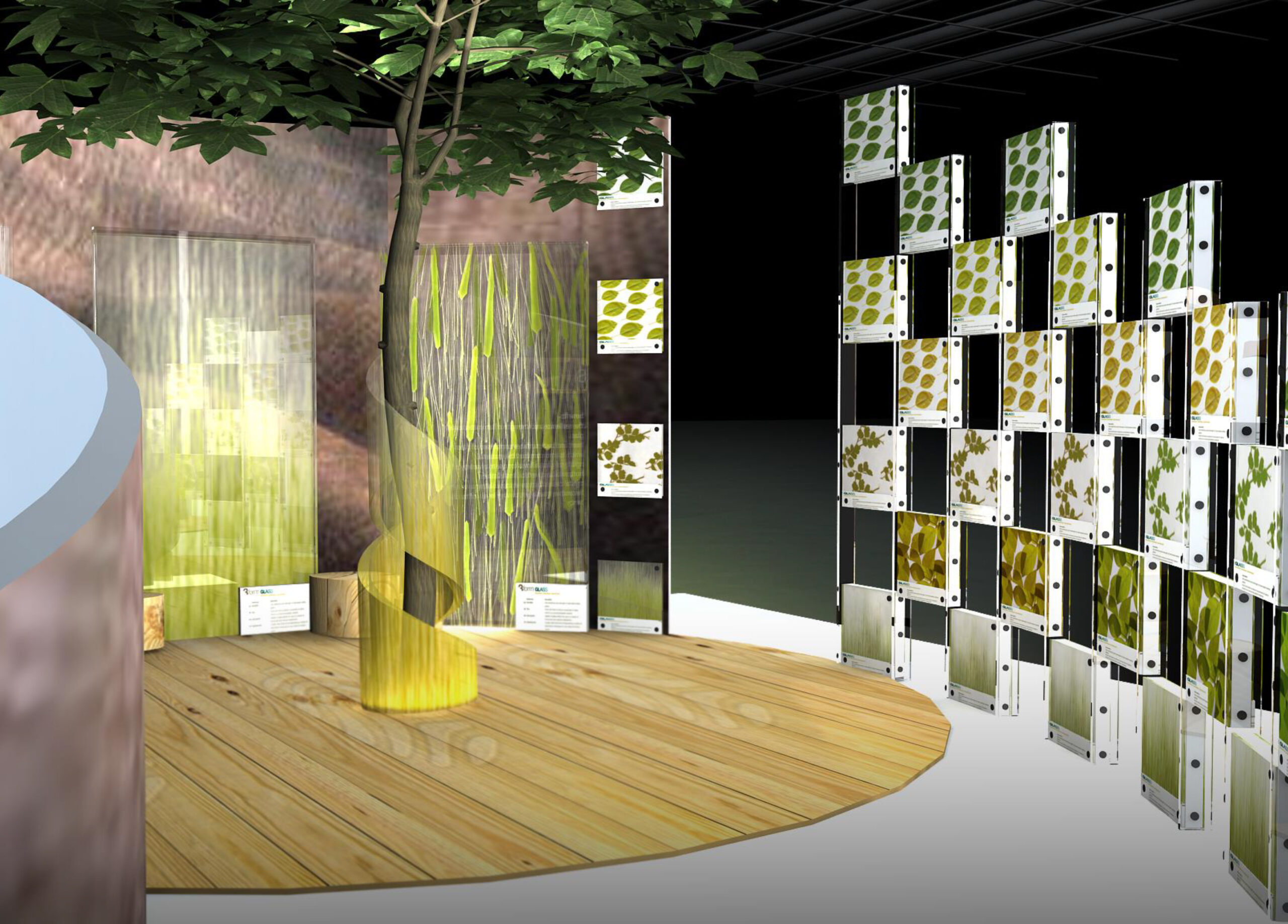 Vách trưng bày các mẫu sản phẩm kính màu cũng được thiết kế đồng nhất với motif cong, mang lại sự liền mạch trong tổng thể gian hàng. Đặc biệt, một cây xanh lớn được đặt ở trung tâm không gian, không chỉ tạo điểm nhấn tươi mát cho gian hàng mà còn nhấn mạnh thông điệp thân thiện với môi trường của sản phẩm, bởi kính trang trí được sử dụng hoàn toàn từ thiên nhiên, hòa quyện cùng không gian xanh mát, thân thiện với con người và môi trường.