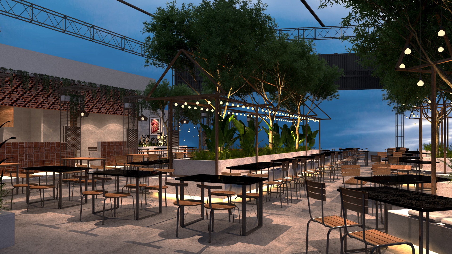 Việc bố trí và lựa chọn các loại cây xanh xung quanh khu vực quán được xem là yếu tố then chốt trong thiết kế, nhằm không chỉ mang lại vẻ đẹp tự nhiên, mà còn tạo ra không khí trong lành và thư giãn cho khách hàng. Những mảng xanh được bố trí hợp lý không chỉ làm dịu đi sự thô ráp của các vật liệu công nghiệp mà còn góp phần tạo nên sự hài hòa, dễ chịu cho không gian ngoài trời.