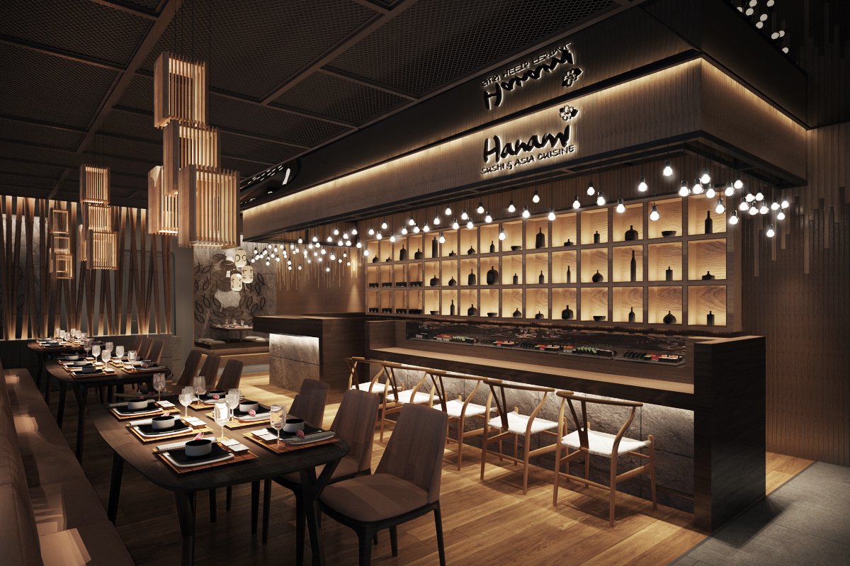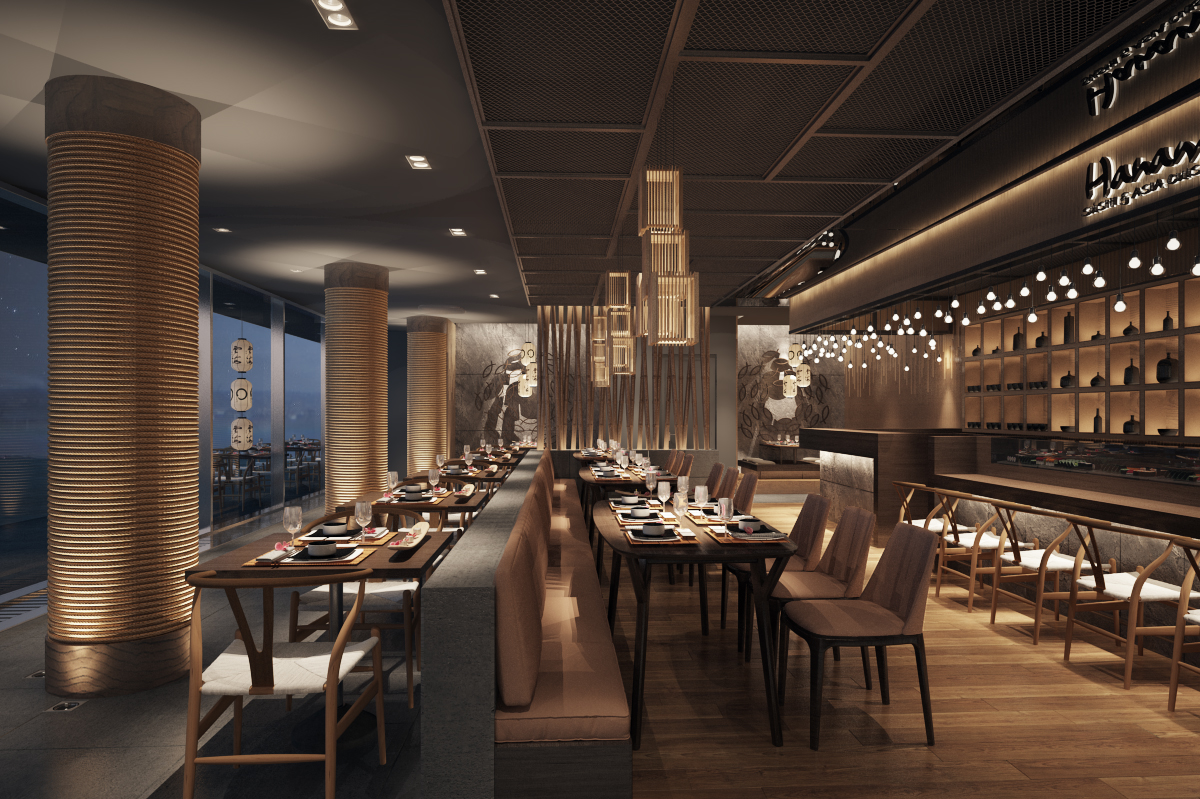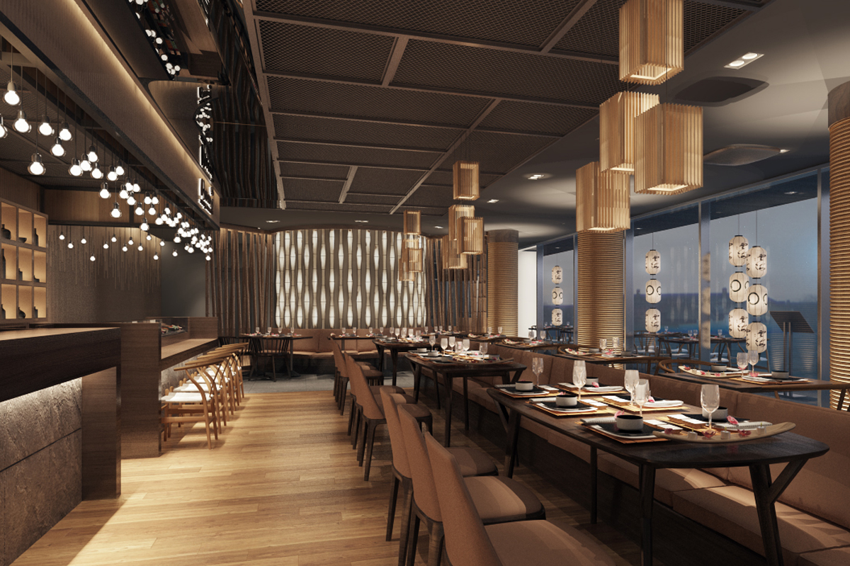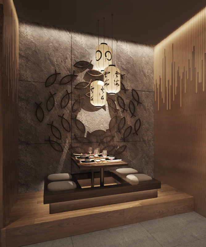 Nhà hàng Nhật Bản tọa lạc tại tầng trệt của một khu trung tâm thương mại, mang đậm phong cách thiết kế hiện đại và sang trọng. Mục tiêu chính của thiết kế là tạo ra một không gian thoải mái và dễ chịu cho thực khách, đồng thời vẫn giữ được nét đặc trưng của văn hóa Nhật Bản. Các yếu tố truyền thống như đèn lồng, ký hiệu tiếng Nhật, và lam gỗ được khéo léo kết hợp, tạo nên những điểm nhấn tinh tế, giúp không gian vừa hiện đại, vừa giữ được sự ấm cúng và thân thiện.