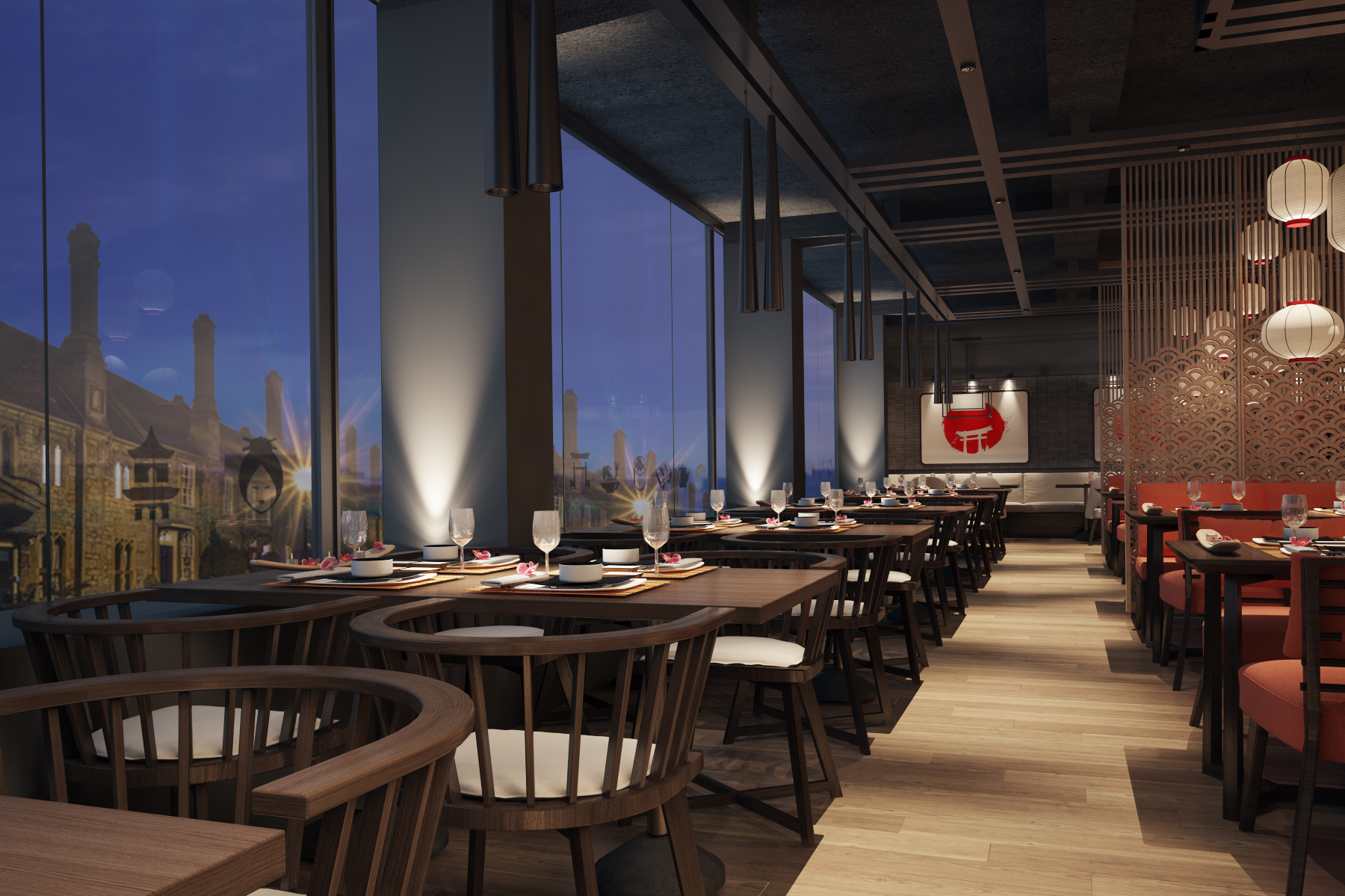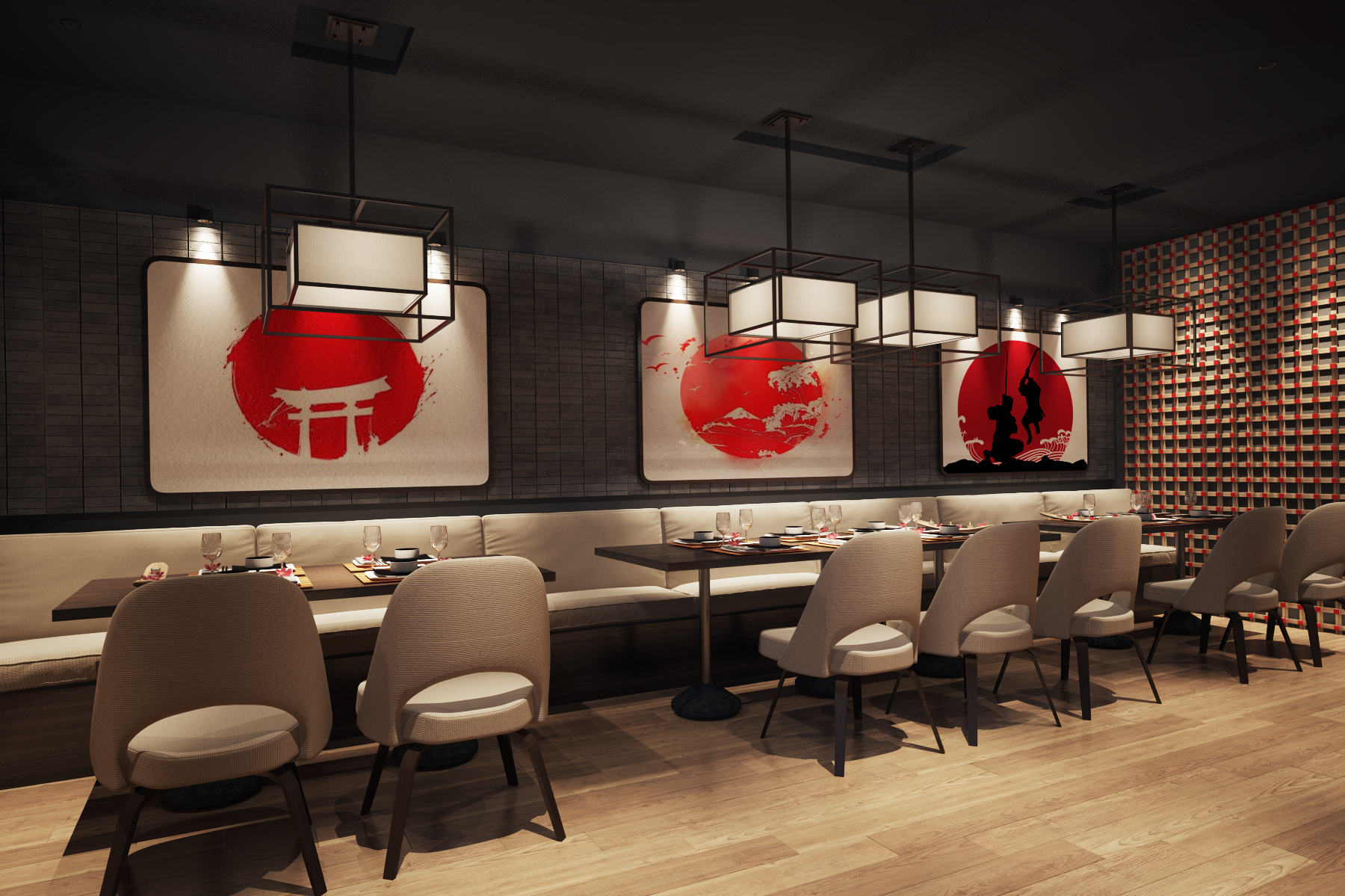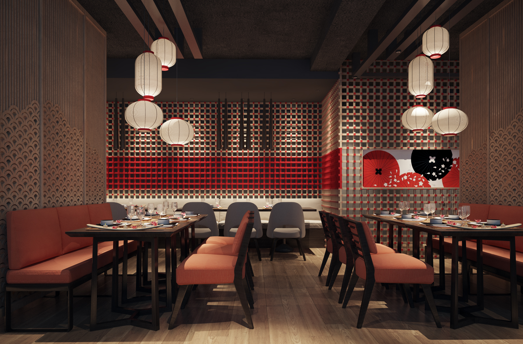 Nhà hàng Nhật Bản này được thiết kế theo phong cách hiện đại, kết hợp khéo léo với gam màu đỏ nổi bật, tạo nên một không gian ấn tượng và đầy năng lượng. Những yếu tố trang trí đặc trưng như đèn lồng và tranh vẽ phong cách Nhật Bản không chỉ làm tăng giá trị thẩm mỹ mà còn góp phần tạo dựng không khí đặc trưng của xứ sở hoa anh đào.