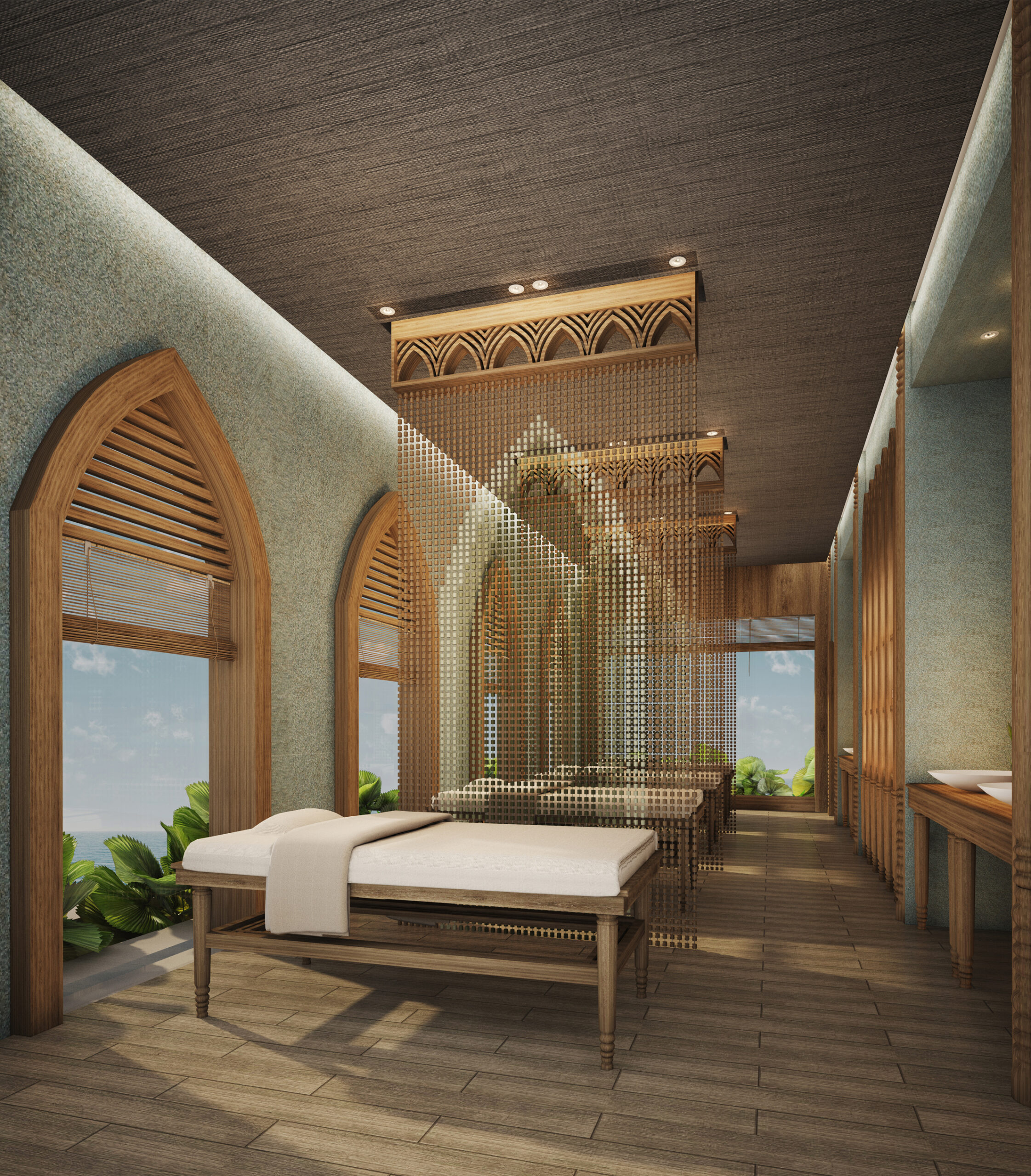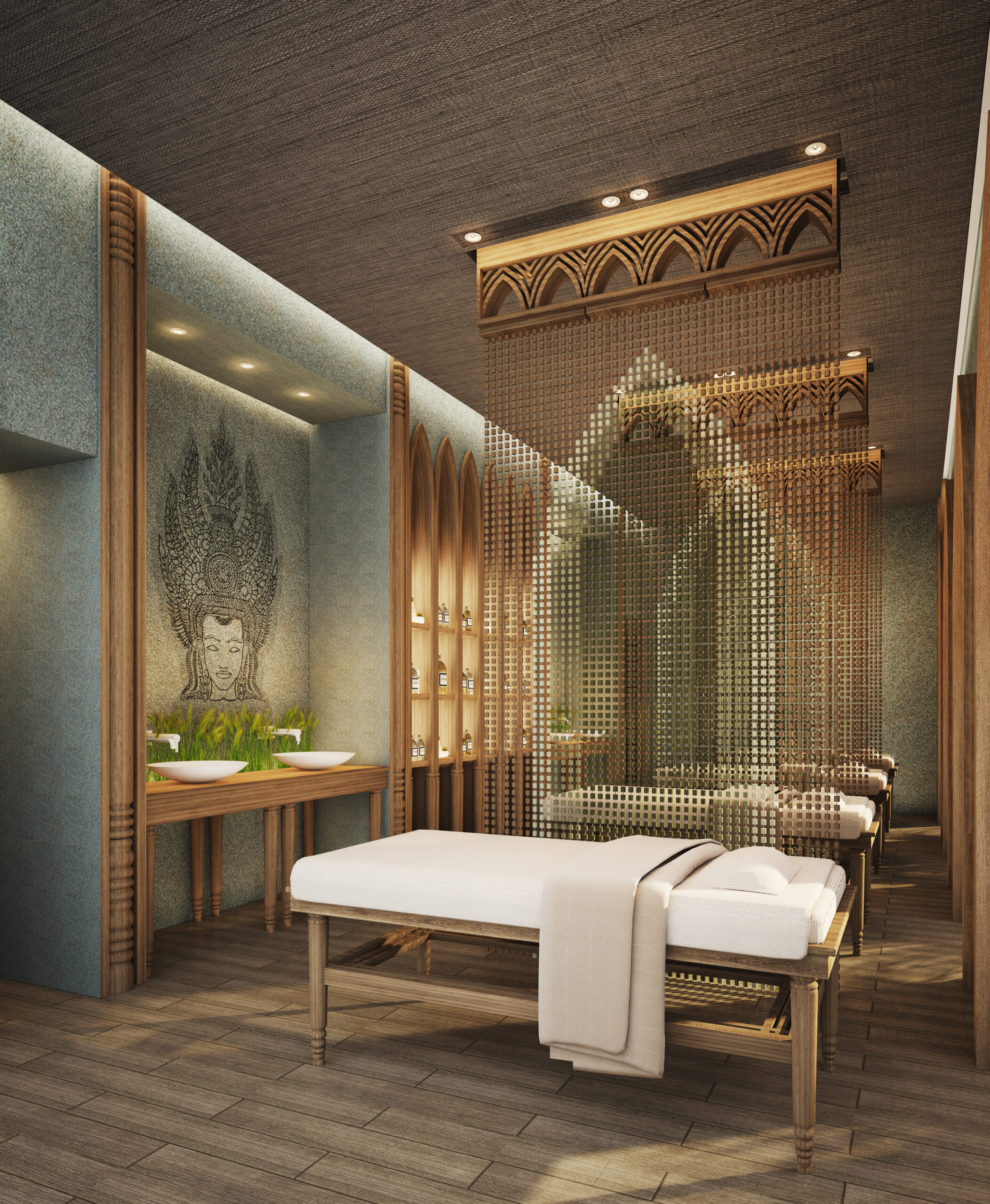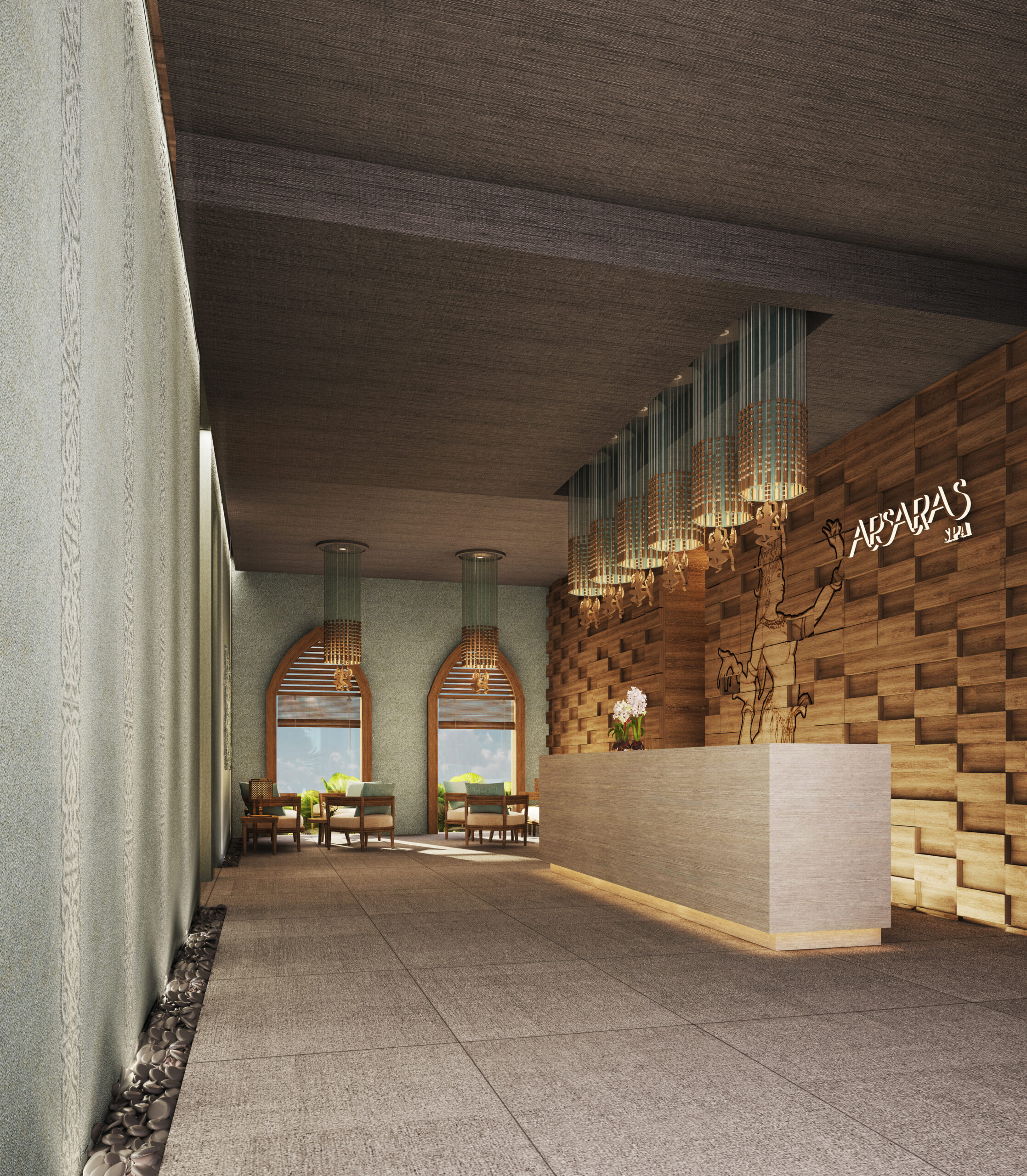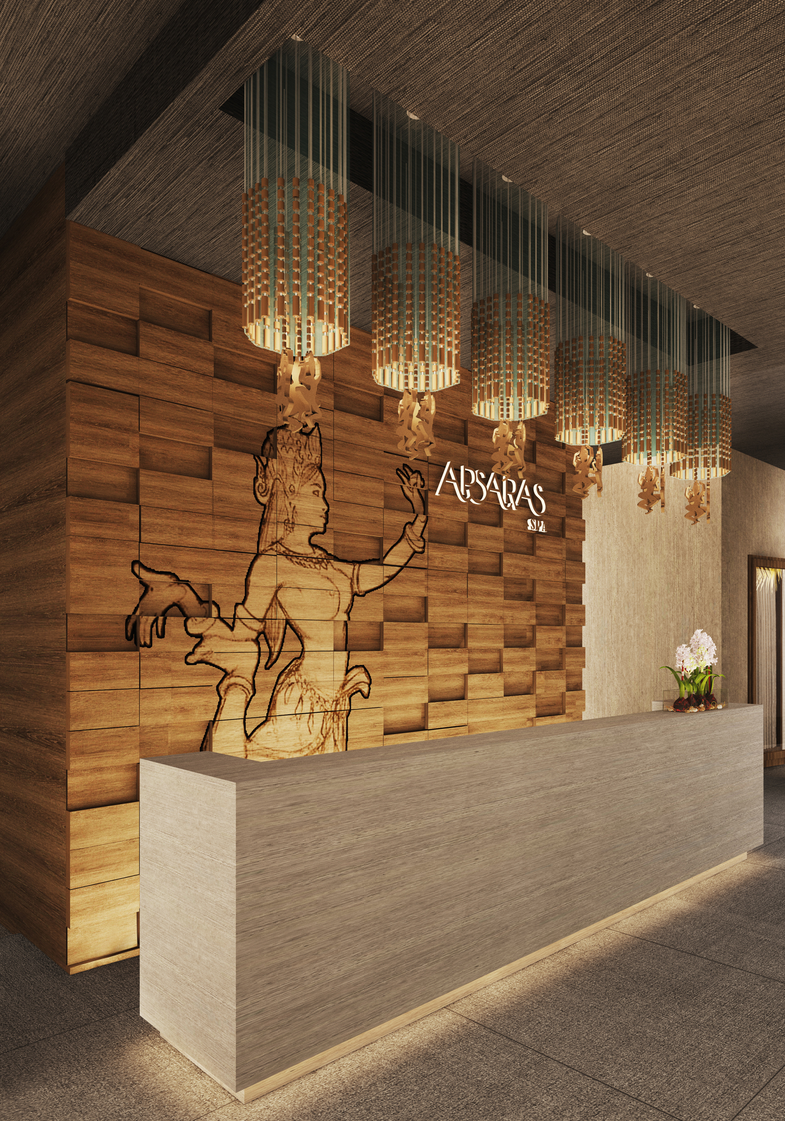 Với chủ đề vẻ đẹp của vũ nữ Apsara cho spa, vì vậy việc truyền tải được tinh thần của chủ đề vào không gian là một trong những điều rất được chú trọng trong thiết kế. Những yếu tố trang trí như tranh vẽ, đèn trang trí với hình ảnh các vũ nữ, tạo nên các điểm nhấn mang tính riêng biệt và ấn tượng của spa. Bên cạnh đó, việc khai thác các view nhìn ra biển cho các không gian phòng massage tạo thêm sự thư giãn của một spa cạnh biển. Gam màu xanh ngọc kết hợp với tone gỗ ấm, mang lại cảm giác vừa ấm áp vừa mát mẻ cho không gian.