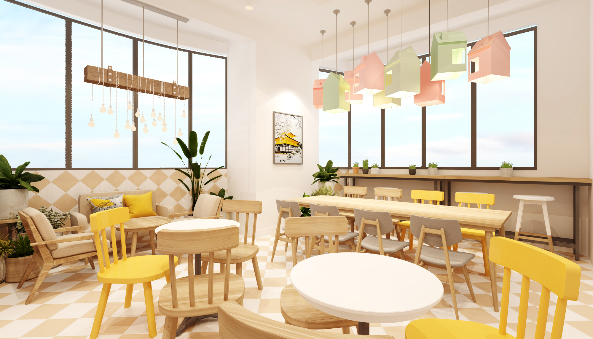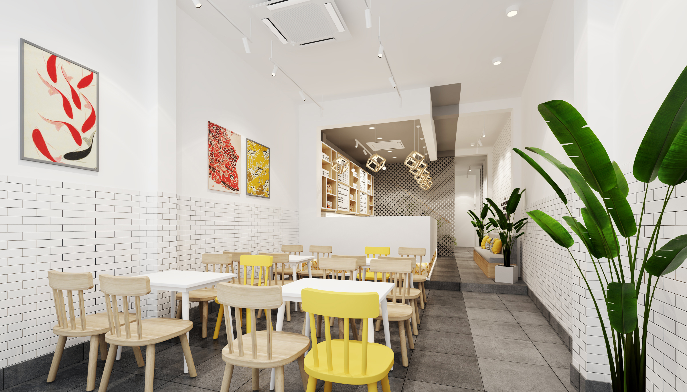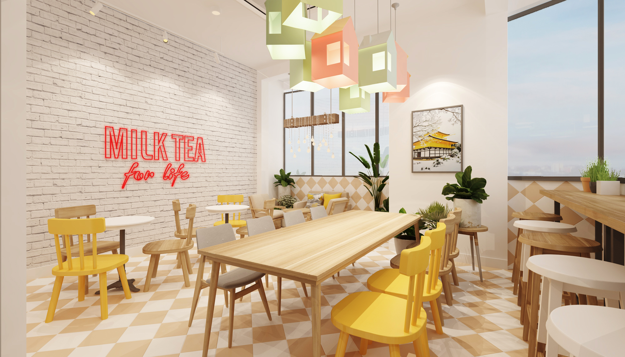 Sự kết hợp tinh tế giữa các gam màu tươi vui cùng nền màu gỗ trầm ấm giúp mang lại không khí tươi trẻ và vui vẻ cho không gian trà sữa, làm cho khách hàng cảm thấy thoải mái và dễ chịu khi thưởng thức những ly trà sữa yêu thích. Đây là một không gian không chỉ để thưởng thức mà còn để tận hưởng, tạo nên những trải nghiệm đáng nhớ cho mỗi khách hàng.