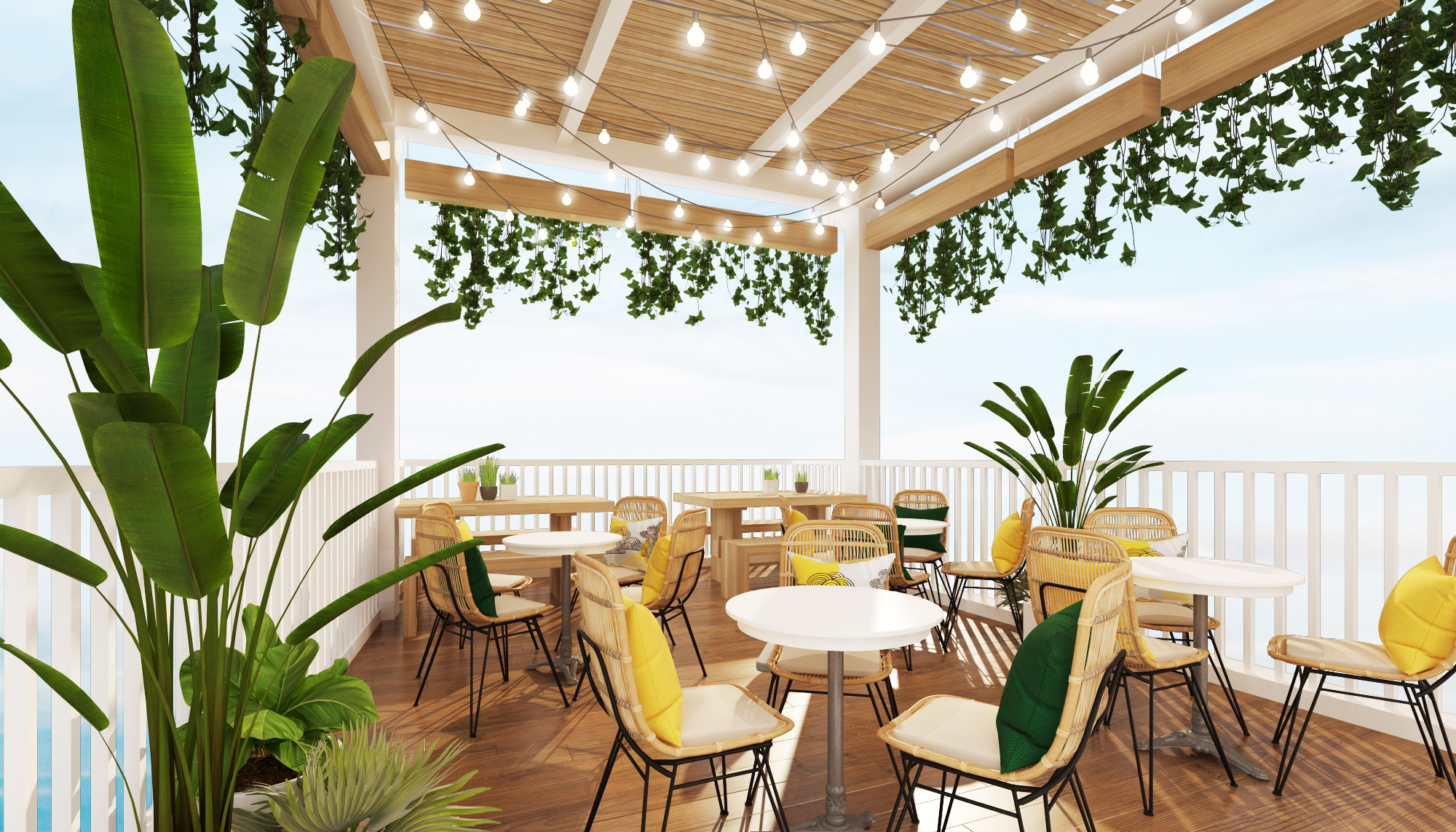 Không gian trà sữa được thiết kế theo phong cách hiện đại nhiệt đới, với các chi tiết điểm nhấn mang đậm hương vị miền biển. Các yếu tố như đèn lồng đặc trưng và cây xanh nhiệt đới không chỉ tạo nên điểm nhấn thú vị mà còn mang đến tính riêng biệt cho quán. Những chi tiết này làm nổi bật không gian, đồng thời tạo ra một không gian thư giãn, gần gũi và đầy sức sống.