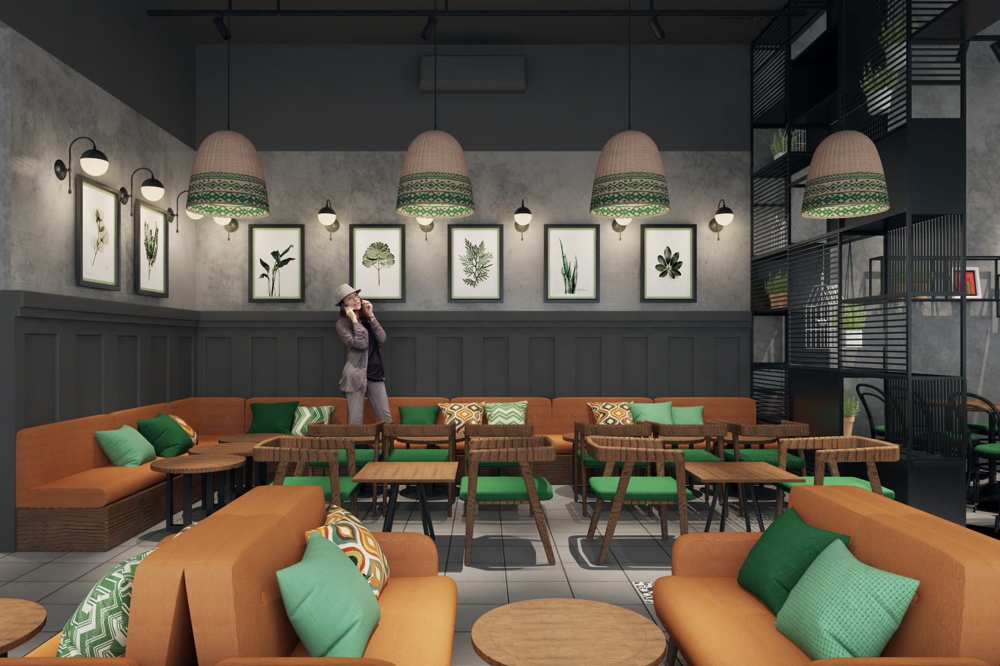 Phong cách thiết kế hiện đại được lựa chọn để tối ưu hóa công năng và tạo ra một không gian thoải mái, trẻ trung. Các tông màu xám và gỗ tối được sử dụng trong kiến trúc và nội thất, giúp làm nổi bật màu xanh lá chủ đạo, đồng thời tạo nên sự cân bằng và tinh tế. Sự kết hợp khéo léo với các màu sắc nổi bật như cam, cùng các họa tiết màu sắc rực rỡ, không chỉ làm cho không gian trở nên sinh động mà còn phù hợp với đối tượng khách hàng trẻ tuổi, năng động.