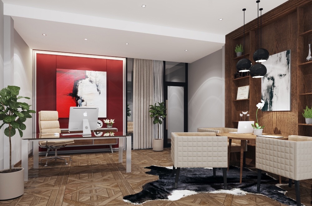 Văn phòng được thiết kế theo phong cách hiện đại, với bảng màu trung tính gồm nâu, đen và trắng làm chủ đạo, tạo nên vẻ đẹp thanh lịch và chuyên nghiệp. Điểm nhấn đặc biệt là bức tranh đỏ nổi bật, được bố trí tại vị trí ghế ngồi của giám đốc, vừa tạo sự cuốn hút vừa tôn lên cá tính và vị thế của người lãnh đạo.