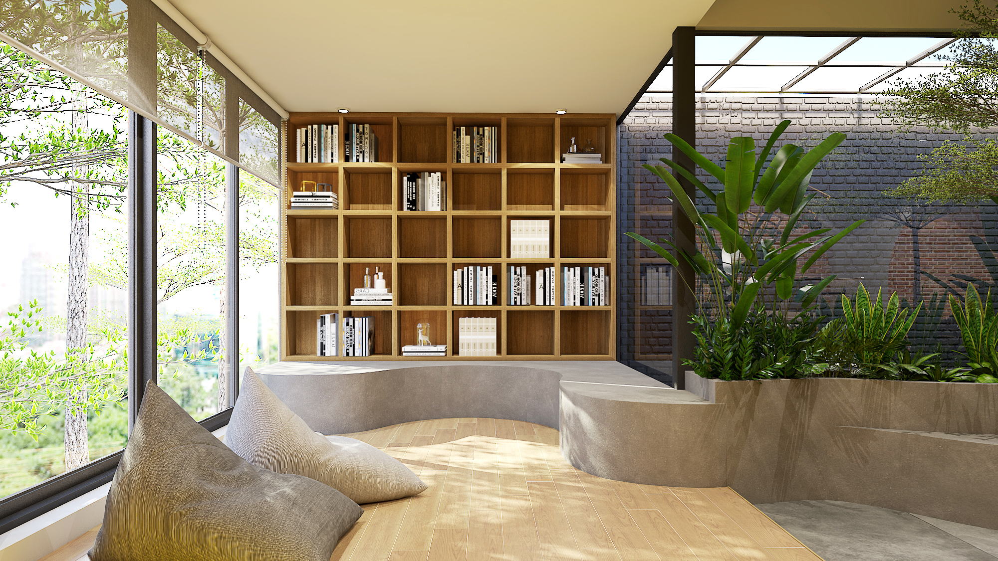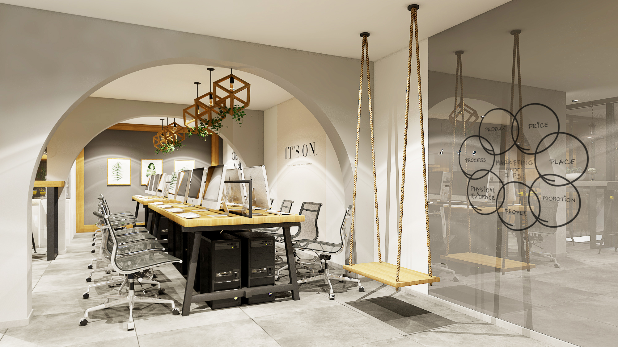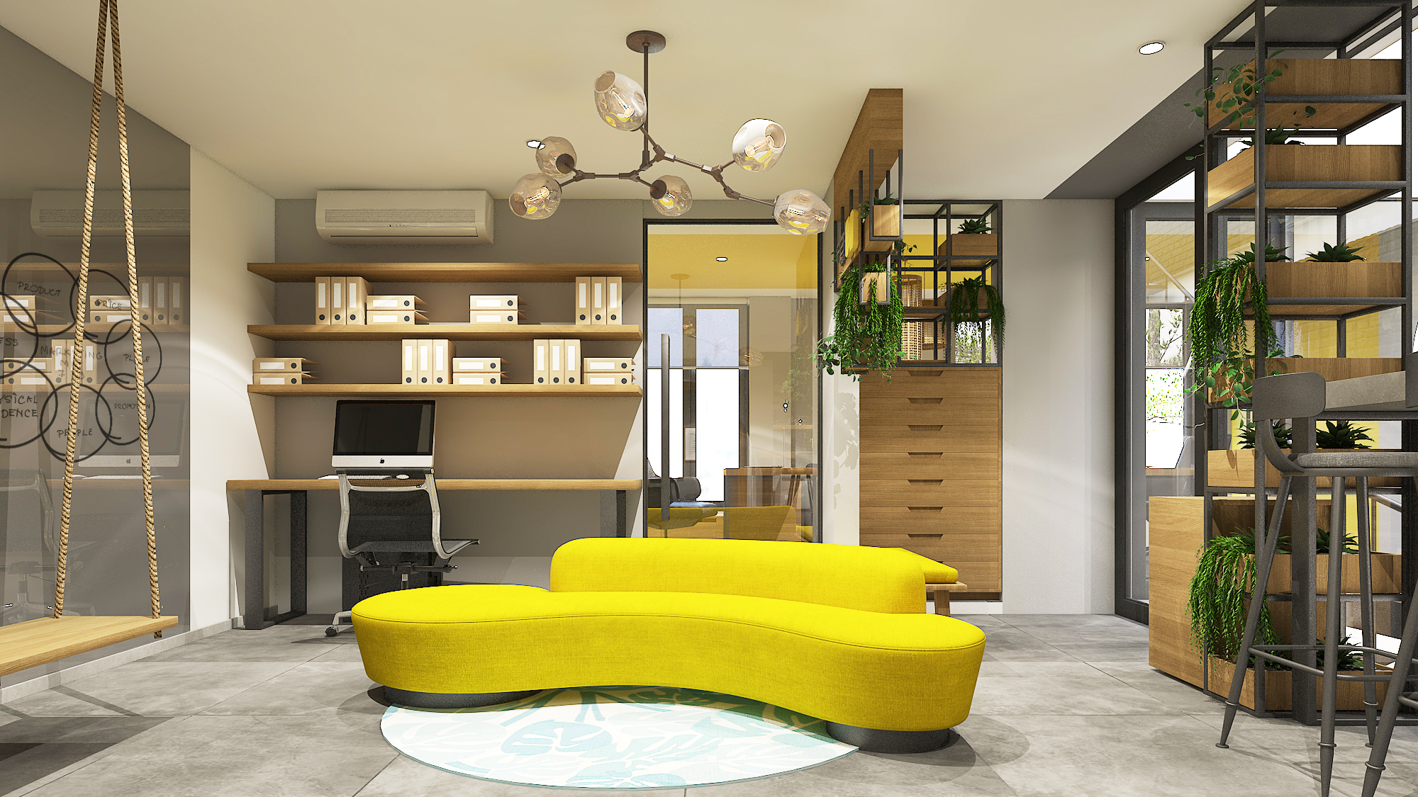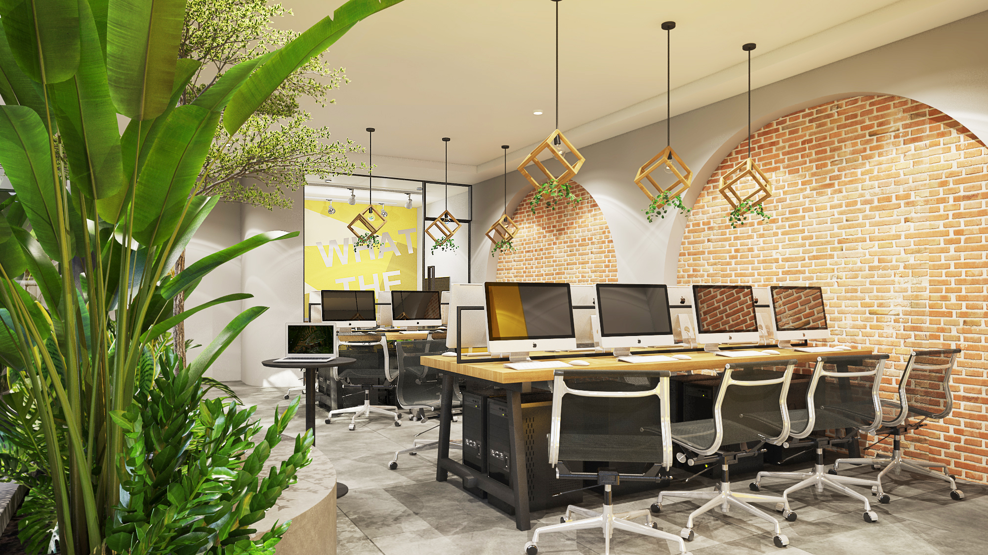 Văn phòng được thiết kế theo phong cách industrial, kết hợp với những đường cong hiện đại, tạo nên sự mềm mại và hài hòa cho không gian làm việc. Các khu vực làm việc được kết nối chặt chẽ với cảnh quan xung quanh thông qua các góc vườn nhỏ và các chi tiết đèn cây cảnh, mang lại một không gian làm việc xanh mát và thư giãn.