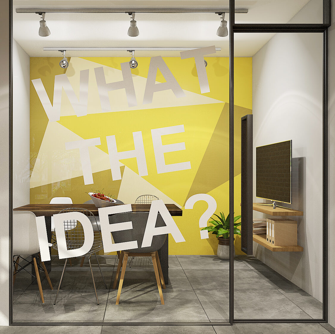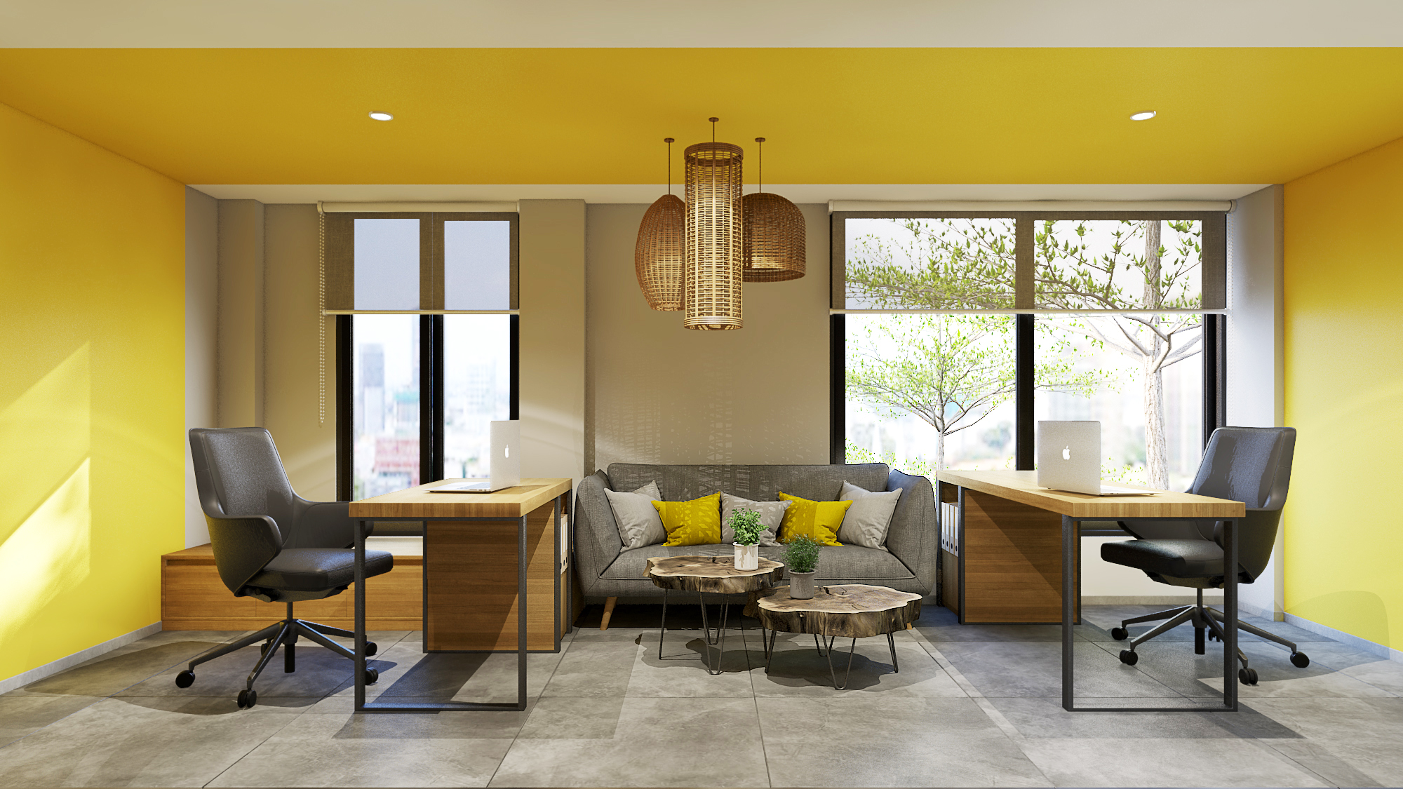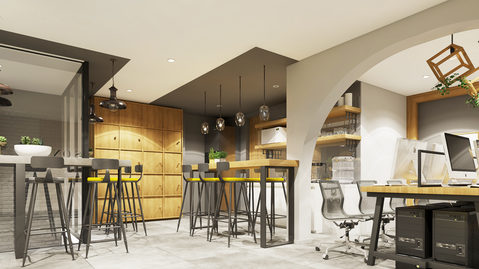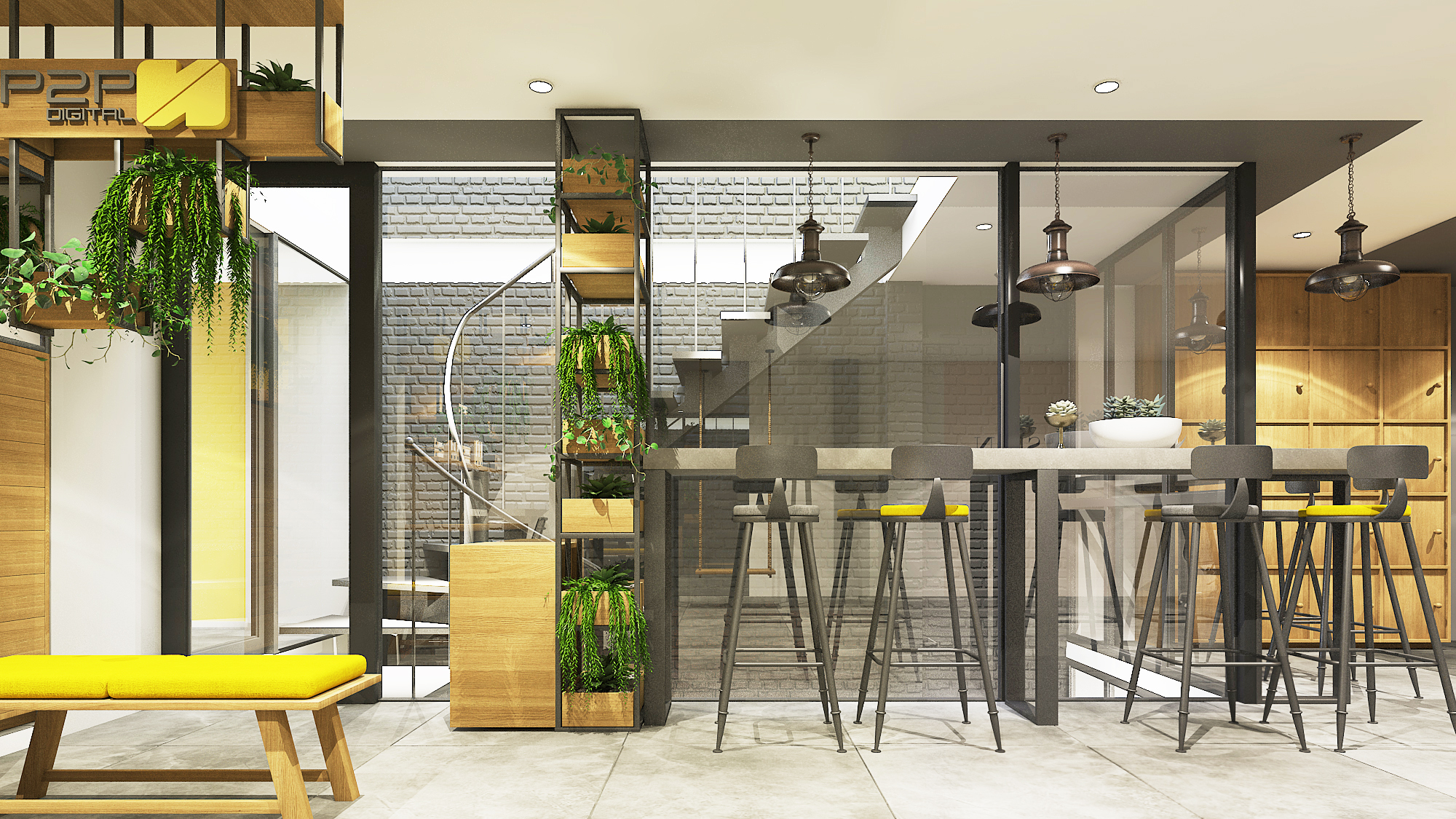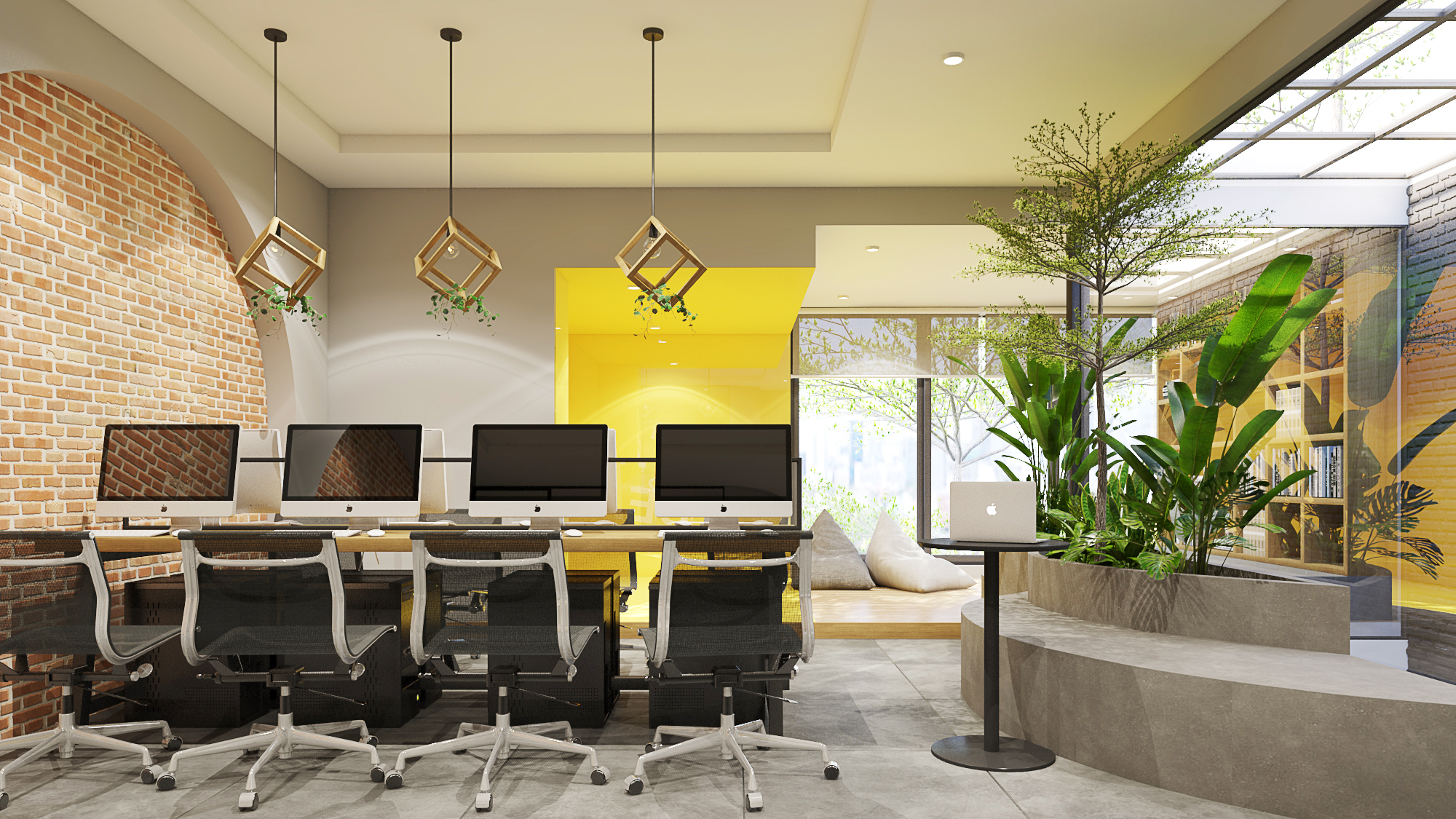 Việc sử dụng các vật liệu tương phản giữa sự thô mộc của gạch giả cổ và sự bóng bẩy của kính màu tạo ra hiệu ứng thị giác thú vị, làm nổi bật vẻ đẹp tổng thể của không gian. Bên cạnh đó, việc áp dụng màu vàng thương hiệu một cách hợp lý giúp tạo điểm nhấn, thu hút ánh nhìn và làm nổi bật từng khu vực trong văn phòng.